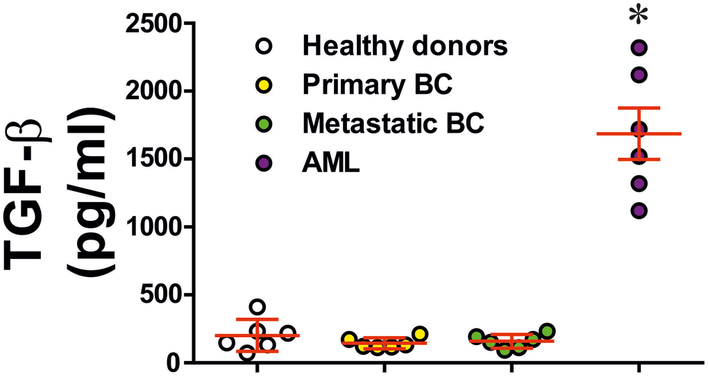 To understand the role of TGF-β we analysed blood plasma of six healthy donors, six primary breast cancer patients, six metastatic breast cancer patients and six AML patients. In cases of primary and metastatic breast cancers, blood plasma levels of TGF-β were similar to those in healthy donors. However, in AML patients they were strikingly and significantly elevated (Figure 3). These results suggest that in solid tumours, like primary and metastatic breast tumours, produced TGF-β most likely remains in the tumour microenvironment while in the case of AML, this growth factor is secreted into the peripheral blood and can be employed by circulating AML cells.