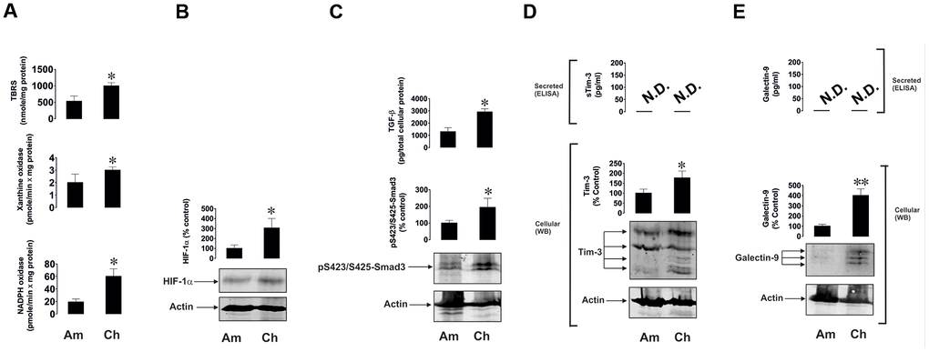 Intriguingly, primary human embryonic cells obtained from chorion (around week 13 of pregnancy) of seven pregnant patients and amniotic liquid obtained from another seven patients (between weeks 20 and 25) had clearly detectable activities of xanthine oxidase, NADPH oxidase and TBRS (Figure 4A). The earlier the stage was, the higher was the level of oxidative burst. A similar pattern was observed for HIF-1α, secreted TGF-β and phospho-S423/S425-Smad3 levels (Figure 4B, 4C). Respectively, Tim-3 and galectin-9 were clearly detectable in both cell types, although not secreted, and were significantly higher at earlier pregnancy stages (Figure 4D, 4E).