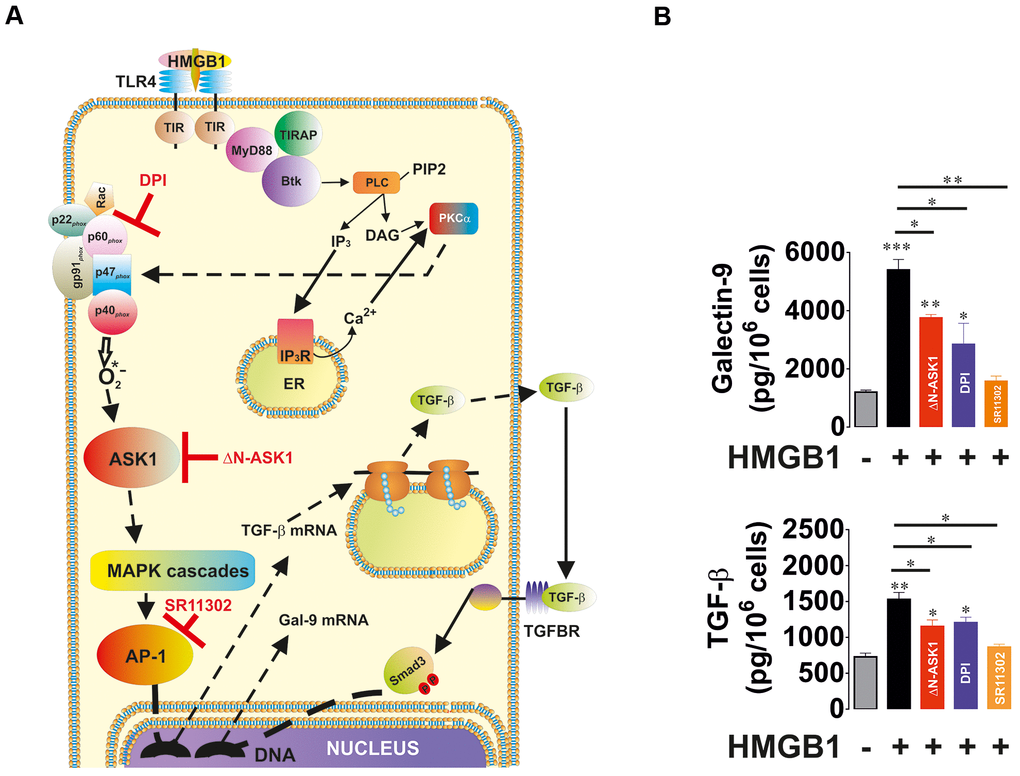 In order to understand the ability of redox-dependent ASK1-mediated activation of AP-1 in TGF-β and galectin-9 production, we used THP-1 human acute myeloid leukaemia cells which express Toll-like receptor 4 (TLR4; Figure 5A). Cells were exposed for 24 h to 1 μg/ml high mobility group box 1 (HMGB1) protein. We found that HMGB1 induced the secretion of TGF-β and galectin-9 by THP-1 cells (Figure 5B). To investigate the contribution of the NADPH oxidase–ASK1–AP-1 redox-dependent pathway to TGF-β expression we pre-treated the cells with 30 μM DPI (Diphenyleneiodonium chloride, NADPH oxidase inhibitor) or 1 μM SR11302 (AP-1 inhibitor) for 1 h before exposing them for 24 h to HMGB1. Another set of cells was subjected to transfection with dominant-negative ASK1 (ΔN-ASK1), to block the activity of this enzyme prior to the 24 h exposure to HMGB1. We found that HMGB1 induced TGF-β and galectin-9 secretion (Figure 5B). DPI, SR11302 and ΔN-ASK1 attenuated the effect, suggesting that redox-induced ASK-1-mediated AP-1 activation leads to increased TGF-β and galectin-9 production by THP-1 cells.