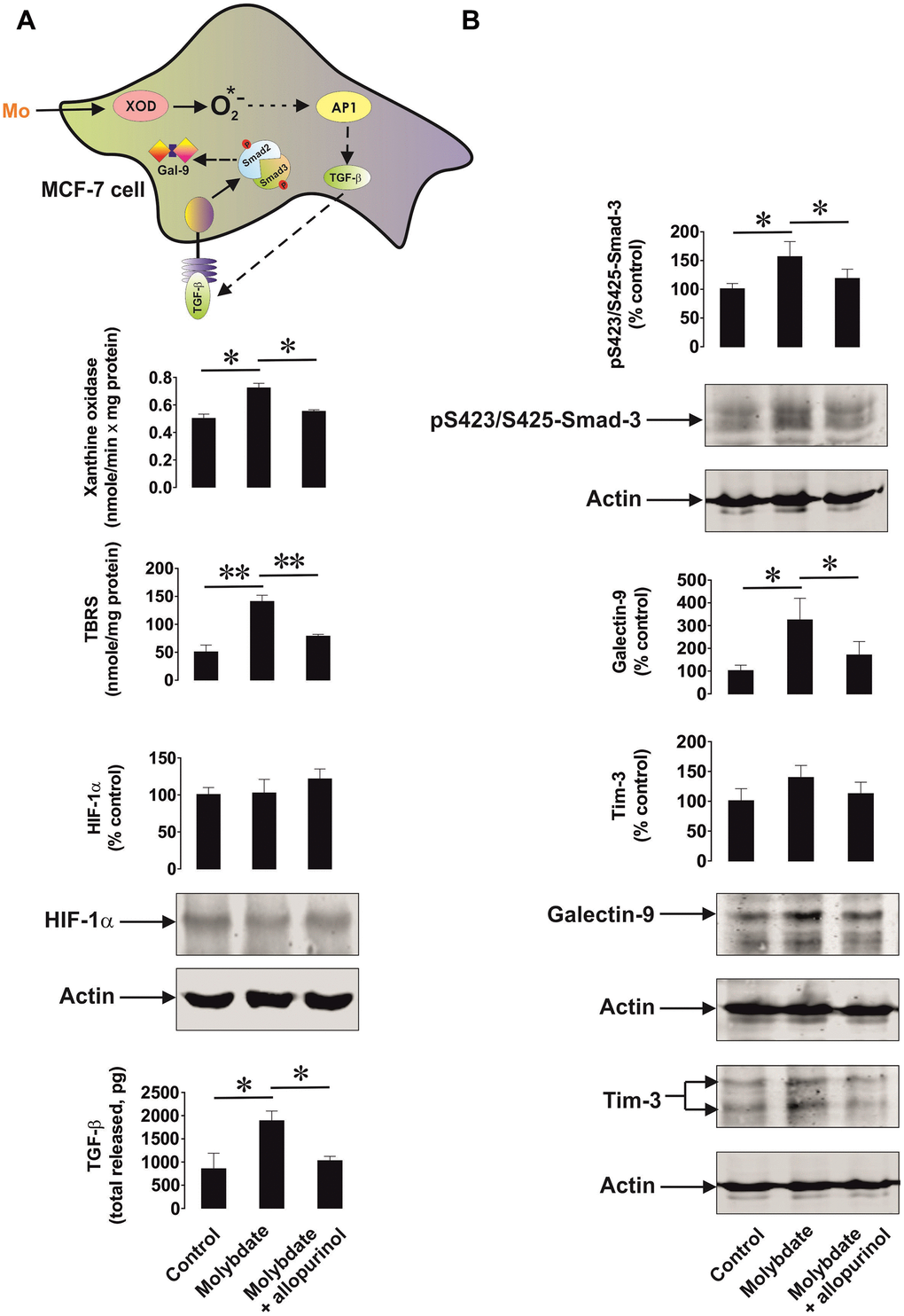We then studied the ability of xanthine oxidase to upregulate TGF-β production. We used MCF-7 breast cancer cells, which express xanthine oxidase [21] and induced its activity by ammonium molybdate. Xanthine oxidase is a molybdenum-containing enzyme, so excess of molybdenum converts all the available xanthine oxidase molecules into their active form. To confirm the specificity of the effect we exposed MCF-7 cells to 100 μg/ml ammonium molybdate for 24 h in the absence or presence of 250 μg/ml allopurinol, a specific xanthine oxidase inhibitor. We found that xanthine oxidase activity was significantly upregulated by molybdate in MCF-7 cells (Figure 6A). This led to increased oxidative burst based on significantly increased TBRS levels. Xanthine oxidase activation was not able to induce HIF-1α accumulation but the level of secreted TGF-β was significantly increased (Figure 6A). This resulted in a significant upregulation of Smad3 S423/S425 phosphorylation (Figure 6B). As a result, galectin-9 expression was also significantly increased (Figure 6B). Allopurinol attenuated all these effects (Figure 6A, B), indicating a specific role for xanthine oxidase in the processes outlined above.