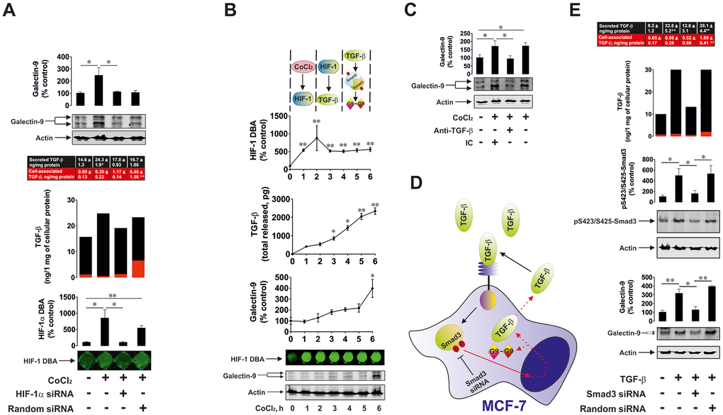 We then considered the effect of HIF-1 activation on TGF-β production and its subsequent effect on galectin-9 expression. We exposed wild type and HIF-1α knockdown (achieved by transfection of HIF-1α siRNA) MCF-7 cells as well as those transfected with random siRNA to 50 μM cobalt chloride (CoCl2) for 6 h (Co cations directly inhibit degradative hydroxylation of HIF-1α [24]), followed by measurement of HIF-1 DNA-binding activity, cell-associated and secreted TGFβ (ELISA) as well as cellular galectin-9 levels (Western blot – MCF-7 cells do not secrete galectin-9). We found that CoCl2 induced significant upregulation of HIF-1 DNA-binding activity in wild type and random siRNA-transfected MCF-7 cells (Figure 7A). No effect was observed in HIF-1α knockdown cells (Figure 7A). In wild type cells CoCl2 induced significant upregulation of secreted and total levels of TGF-β. The effect was not observed in HIF-1α knockdown cells (Figure 7A). In MCF-7 cells transfected with random siRNA, the level of total TGF-β was upregulated to the one observed in wild type cells exposed to CoCl2. However, the application of DOTAP to transfect these cells with random siRNA together with CoCl2 slowed down the process of TGF-β secretion. As a result, the level of galectin-9 was only upregulated in wild type MCF-7 cells treated with CoCl2 (Figure 7). These results suggest that HIF-1 induces the expression of TGF-β, which then facilitates the upregulation of galectin-9 expression. To further investigate this assumption we studied the dynamics of the process. We exposed wild type MCF-7 cells to 50 μM CoCl2 for 1, 2, 3, 4, 5 and 6 h time points and detected HIF-1 DNA-binding activity, levels of secreted TGF-β and cellular galectin-9 expressions. We found that HIF-1 DNA-binding activity was increased after 1 h of exposure to CoCl2, while the levels of secreted TGF-β were significantly increased following 3 h of exposure (Figure 7B). Cellular galectin-9 level was significantly upregulated only in 6 h of exposure to CoCl2 (Figure 7B). To specifically confirm the contribution of TGF-β in regulating galectin-9 expressions, we exposed wild type MCF-7 cells to 50 μM CoCl2 for 6 h in the absence or presence of TGF-β neutralising antibody or isotype control antibody. We found that TGF-β neutralising antibody but not the isotype control attenuated CoCl2-induced galectin-9 upregulation in MCF-7 cells (Figure 7C). All these findings clearly demonstrated that HIF-1 induces TGF-β production which displays autocrine activity and triggers galectin-9 expression.