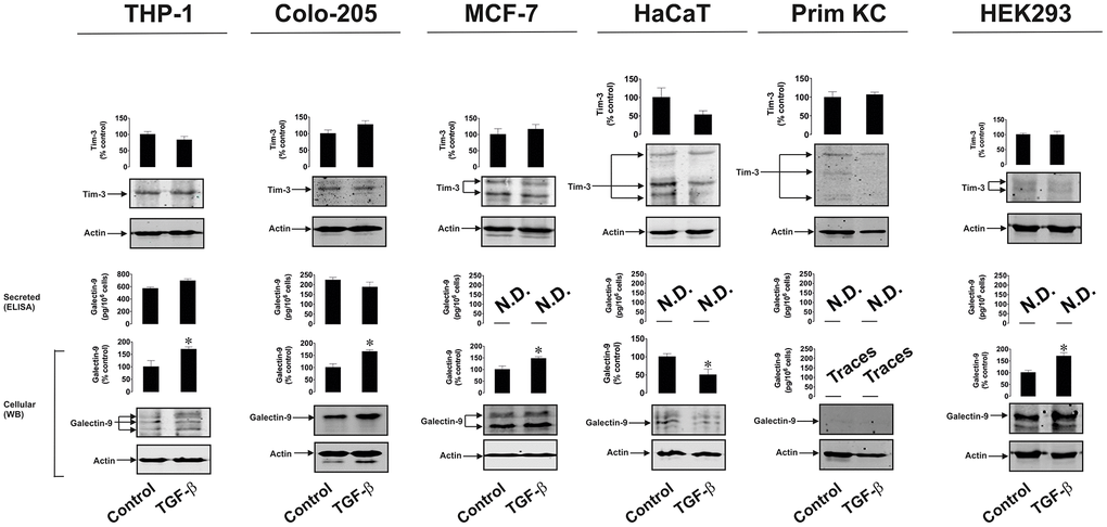 To confirm and study the differential effects of TGF-β on galectin-9 expression we treated THP-1 human AML cells, Colo205 human colorectal cancer cells, MCF-7 human breast cancer cells, HaCaT human keratinocytes (non-malignant cells), primary healthy human keratinocytes as well as HEK293 human embryonic kidney cells, with 2 ng/ml human recombinant TGF-β (specifically TGF-β type 1 was used) for 24 h. Cellular and secreted levels of galectin-9 and Tim-3 were then determined. We found that in all types of human cancer cells and in HEK293, TGF-β upregulated the amounts of expressed galectin-9 but not Tim-3. However, in non-malignant cells (both types of keratinocytes), no upregulation of either galectin-9 or Tim-3 expression was observed (Figure 8). Both types of keratinocytes expressed barely detectable levels of galectin-9 and this was not inducible by TGF-β. To find out whether such a phenomenon (the absence of induction of galectin-9 expression by TGF-β) applies also to cancer cells we used K562 chronic myeloid leukaemia cells which express only traces of galectin-9 protein [1] compared to for example THP-1 or other AML cells. Exposure of these cells to increasing concentrations of TGF-β for 24 h led to a clear induction of galectin-9 expression (Supplementary Figure 2), suggesting differential responses of cancer/embryonic and non-malignant mature human cells. Importantly, levels of phospho-S423/S425 Smad-3 were undetectable in resting K562 cells and were clearly detectable in TGF-β-treated cells (Supplementary Figure 2). Regardless the treatment, K562 cells did not release detectable amounts of galectin-9 (Supplementary Figure 2).