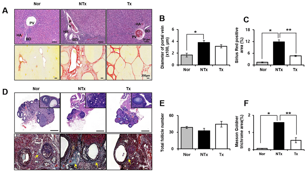 H&E stanning results showed different tissue histology of liver and ovary in TAA-injured rat model. Histopathology of liver and ovary after PD-MSCs transplantation in TAA-injured rat was studied by conducting H&E and Sirius red staining. In non-transplantation (NTx) group, TAA-injured rat liver showed abnormal portal vein (PV), hepatic artery (HA), and bile duct (BD) as well as increase of PV diameter compared with normal liver in H&E staining as shown in Figure 1A, 1B. In addition, vascularized fibrous septa that linked portal tract with central vein were observed in NTx group by Sirius red staining * p<0.05, Figure 1A, 1C). Quantification of collagen deposition in NTx group was significantly increased compared with normal liver. Interestingly, liver from rats with PD-MSCs transplantation (Tx group) showed a recovery in vascular structure according to H&E staining results, which reduced extensive deposition of fibrillar collagen in Sirius red staining (* and ** p<0.05, Figure 1A–1C). In ovary of TAA-injured rat model, the numbers of total follicles including primordial, primary and secondary follicles were decreased in NTx group compared to the normal ovary and increased in PD-MSC Tx group compared to NTx group (Figure 1D, 1E). The follicular atresia is reported to be generated by several external factors such as oxidative stress [12]. Interestingly, follicular atresia was remarkably increased in NTx group compared to the normal ovary and decreased in PD-MSC Tx group compared to NTx group as shown Figure 1D. Furthermore, accumulation of extracellular matrix (ECM) surrounded follicles was significantly increased in NTx group compared with normal group. However, PD-MSCs transplantation mitigated the accumulation of ECM in TAA-injured rat ovary (* and ** p<0.05, Figure 1D, 1F). These data suggest that administration of PD-MSCs in TAA-injured rat liver results in histologically recovered structural change of liver and ovary.
