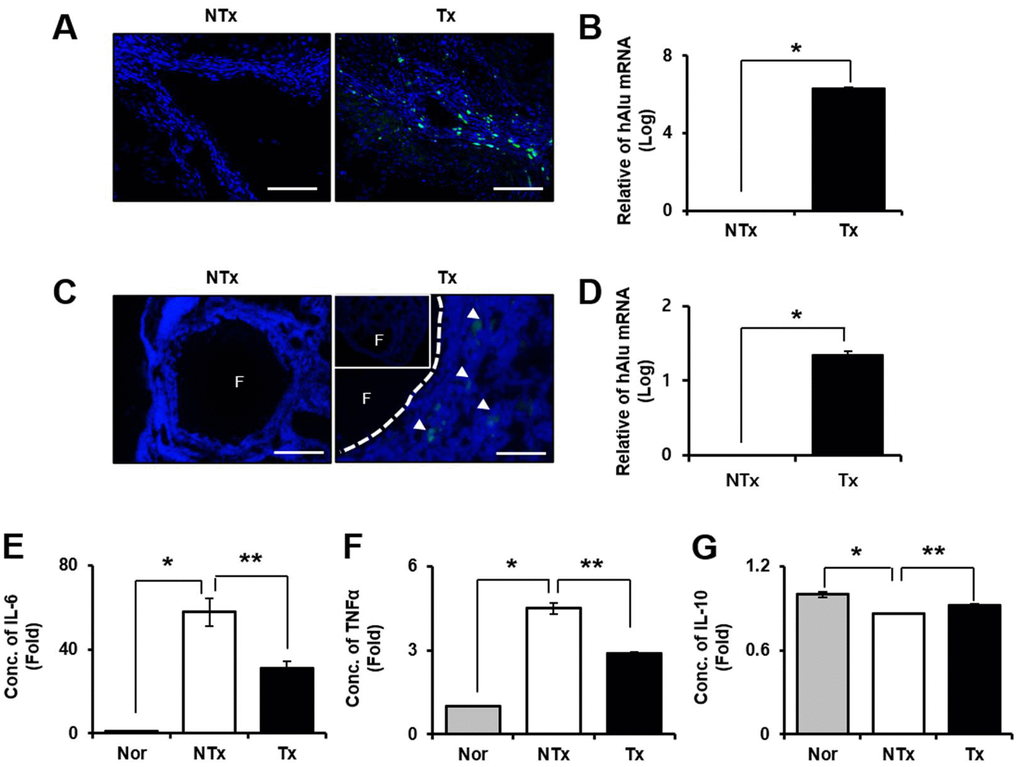 Localization of transplanted stem cells into injured target tissues is an important factor to maximize their therapeutic effects in injured site in tissues. According to the immunofluorescence data shown in Figure 2A, 2C, engraftment of PD-MSCs into target tissues including liver and ovary were traced by PKH67 fluorescence labeling dye (Figure 2A, 2C). Also, the quantification of amount of human Alu mRNA expression after PD-MSC Tx indicates the survival or the repopulation of engrafted PD-MSCs in tissues. As a result, the mRNA expressions of human Alu sequence in PD-MSC Tx group were significantly increased compared to those of NTx group in both liver and ovary * p<0.05, Figure 2B, 2D).
