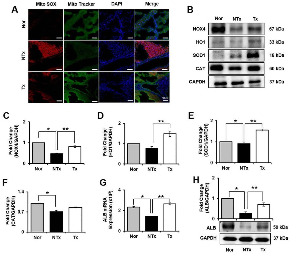 To confirm oxidative stress in TAA-injured rat liver, we analyzed mRNA expression that encodes oxidant and antioxidant factors, such as nicotinamide adenine dinucleotide phosphatase (NADPH) oxidase 4 (NOX4), heme oxygenase-1 (HO1), superoxide dismutase 1 (SOD1), and catalase (CAT). mRNA expression of NOX4 in NTx group significantly increased compared to normal, whereas it was decreased in Tx group versus NTx (* and ** p<0.05, Supplementary Figure 1A). However, HO1, SOD1, and CAT was significantly decreased in NTx group compared to normal (Supplementary Figure 1B–1D). Furthermore, compared to normal liver, the expression of Mito SOX was upregulated in NTx group whereas reduced in Tx group versus NTx (Figure 3A). In addition, protein level of markers related to oxidative stress was confirmed by western blot. HO1, SOD1, CAT levels in Tx group significantly increased compared with NTx (* and ** p<0.05, Figure 3B, 3D–3F). These finding support that PD-MSCs have antioxidant effect that can help recover hepatic function.