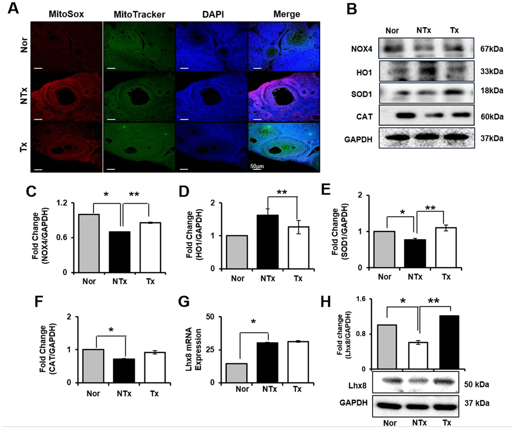 In ovary, we also analyzed how ovary of TAA-injured rat model is affected from ROS and the roles of oxidant and antioxidant factors. As a result, mRNA expression of NOX4 and HO1 significantly increased in NTx and PD-MSC Tx group compared to normal ovary (* p<0.05, Supplementary Figure 2A, 2B). Based on the analysis of antioxidants factors, mRNA expression of SOD1 was significantly decreased in NTx as well as PD-MSC Tx group compared to normal ovary, and CAT was significantly increased in NTx group compared to normal and PD-MSC Tx group (* and ** p<0.05, Supplementary Figure 2C, 2D). Additionally, to analyze the regeneration of ovarian function, the expression of Lhx8 in ovary of TAA-injured rat model was studied. The mRNA and protein expression of Lhx8 was significantly increased in PD-MSC Tx group compared to NTx (** p<0.05, Figure 4H and Supplementary Figure 2E). Moreover, we analyzed antioxidant effect of PD-MSCs by IF and protein expression of related factors in ovary of TAA-injured rat model. As shown Figure 4A, Mito SOX expression in ovary, which shows ROS accumulation, was remarkably increased in NTx group compared to normal and PD-MSC Tx group (Figure 4A). The protein expression of NOX4 was decreased while the HO1 expression was significantly increased in NTx group compared to PD-MSC Tx group (* and ** p<0.05, Figure 4B–4D). Also, the expression of SOD1 and CAT was decreased in NTx group and significantly increased in PD-MSC Tx group (* and ** p<0.05, Figure 4B, 4E, 4F). These data show that PD-MSCs transplantation restored ovarian function via antioxidants effect in TAA-injured rat model.