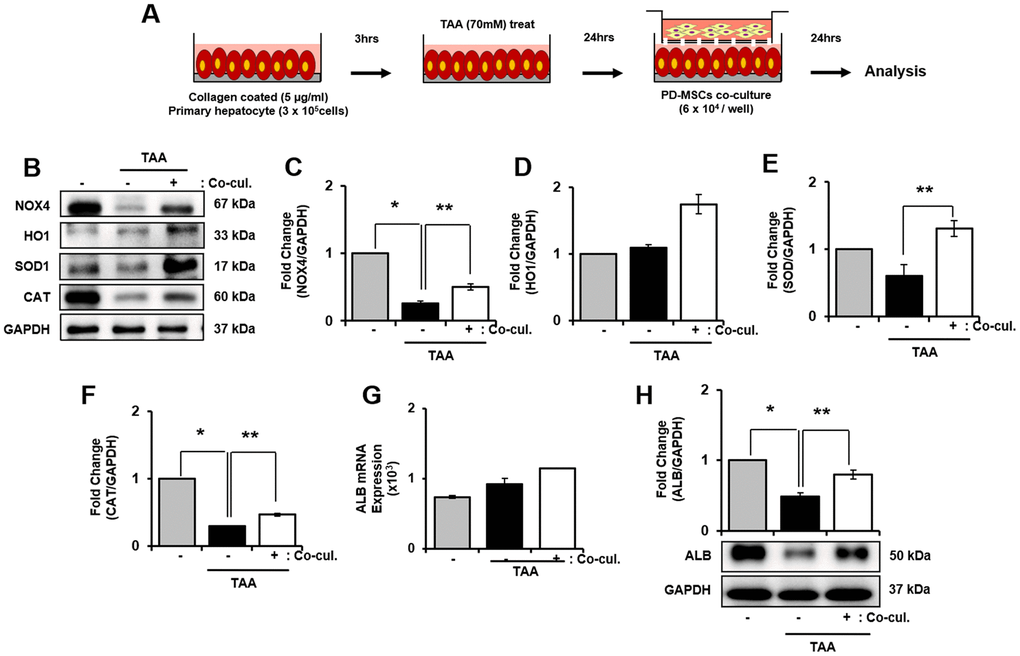 To support our finding in vivo, we induced oxidative stress in primary hepatocytes by treating TAA as shown Figure 5A. mRNA expression of NOX4 in TAA-injured primary hepatocytes increased, however decreased after PD-MSCs co-cultivation (Supplementary Figure 3A). In contrast, TAA treatment caused slightly decreased HO1, SOD1, and CAT in mRNA level (Supplementary Figure 3B–3D). Furthermore, HO1, SOD1, and CAT protein expression after PD-MSCs co-culture was consistently increased compared to TAA-injured primary hepatocytes (* and ** p<0.05, Figure 5B, 5D–5F). In addition, PD-MSCs co-cultivation significantly increased NOX4 and ALB levels (* and ** p<0.05, Figure 5B, 5C, 5G, 5H). These data demonstrate that co-cultivation of PD-MSCs have antioxidant effects in primary hepatocytes.