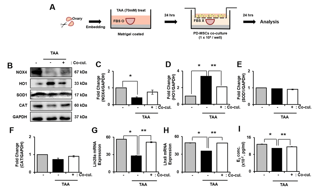 To analyze the factors related to folliculogenesis, we analyzed expression of Lim-28 Homology A (Lin28a), LIM Homeobox 8 (Lhx8), NOBOX oogenesis homeobox (Nobox) and Nanos C2HC-Type Zinc Finger 3 (Nanos3). As a result, gene expression of Lin28a and Lhx8 were clearly decreased in TAA-induced group compared to both control and PD-MSCs co-cultivation group. Also, the gene expression of Lin28 and Lhx8 significantly increased in PD-MSCs co-cultivation group compared to TAA treated group (* and ** p<0.05, Figure 6G, 6H). Also, the gene expression of Nobox and Nanaos3 significantly decreased in TAA treated group compared to control while increased in PD-MSCs co-cultivation group compared to TAA-induced group (Supplementary Figure 4E, 4F). Furthermore, E2 concentration in explant culture media significantly decreased in TAA treated group compared to control and increased in PD-MSCs co-cultivation group (* and ** p<0.05, Figure 6I). Thus, results show that PD-MSCs co-cultivation induce folliculogenesis through antioxidant effects in TAA treated ovary.