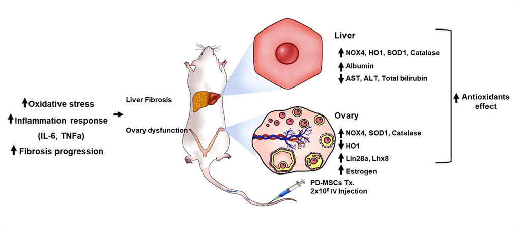 As shown in Figure 7, these findings show that TAA treatment damages both liver and ovary by triggering oxidative stress. PD-MSCs transplantation to this damaged model induces antioxidant activities which restores liver and ovary function by activating regeneration and folliculogenesis factors respectively. Although the hypothalamus-pituitary feedback pathway is the main signaling pathway of hormones related to ovarian function, reasonable conjectures about the relationship between liver and ovary could be made based on plausible evidence. The damage triggered in ovary can be explained by estrogen sulfotransferase (EST) in liver being damaged from TAA treatment, which then causes dysfunction in ovary [21]. Further studies should be done on the relationship between the liver and ovary caused by oxidative stress induced by TAA.