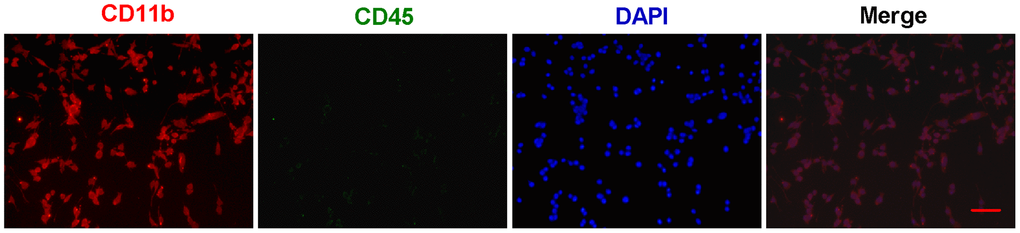 First, primary microglial cells were isolated from one-day-old SD rats and grown in DMEM/F12 medium. The identification and purity of microglial cells was determined by immunofluorescent staining with CD11b (Figure 1). To distinguish microglia from macrophages, we performed the double staining for CD11b and CD45 (Figure 1). And all the CD11b-positive cells almost coincided with all the DAPI-positive cells (Figure 1), suggesting that we obtain the very pure microglia.
