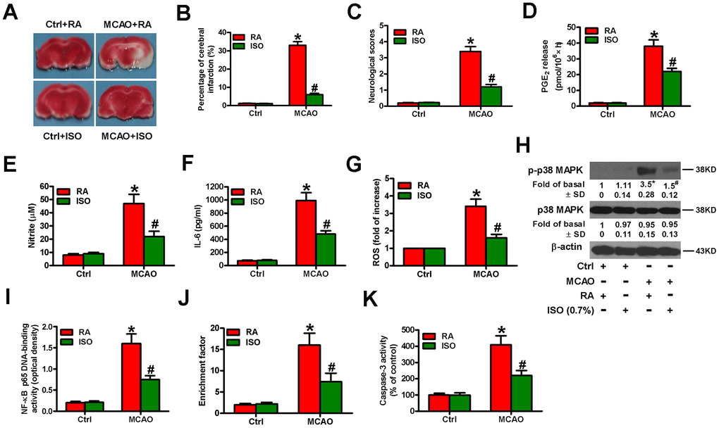 Next, we examined the effects of 0.7% ISO on the brain injuries of MCAO rats. We found that 0.7% ISO reduced infarct volume (Figure 10A, 10B) and neurologic deficit scores (Figure 10C) and serum levels of PGE2 (Figure 10D), NO (Figure 10E), and IL-6 (Figure 10F) in MCAO rats. As shown in Figure 10G, ROS levels were considerably reduced by 0.7% ISO in the brain homogenates of MCAO rats. Western blot analysis showed that 0.7% ISO decreased phosphorylation of p38 MAPK in the MCAO rat brains (Figure 10H). Moreover, 0.7% ISO inhibited NF-κB p65 DNA-binding activity in the brains of MCAO rats (Figure 10I). 0.7% ISO also reduced the apoptosis in the brains of MCAO rats by diminishing nucleosomal fragmentation (Figure 10J) and caspase-3 activity (Figure 10K). These data indicate that 0.7% ISO ameliorates the brain injuries of MCAO rats.