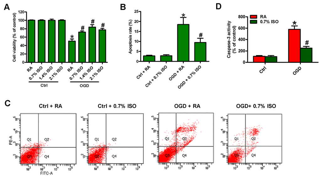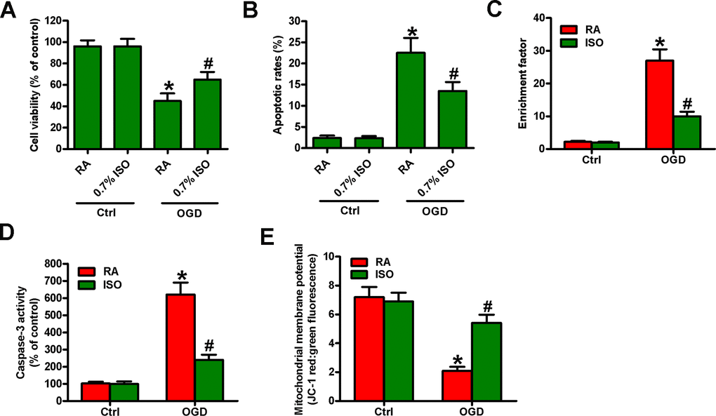 Reportedly, OGD induces neuronal injury [26]. Thus, we explored the effects of 0.7% ISO on OGD-treated rat neurons. As depicted in Figure 9A, OGD markedly decreased neuronal viability, which was counteracted by 0.7% ISO. Moreover, 0.7% ISO significantly reduced OGD-induced enhancement in neuronal apoptosis (Figure 9B–9E). These results reveal that 0.7% ISO increases the survival in OGD-challenged neurons in vitro.