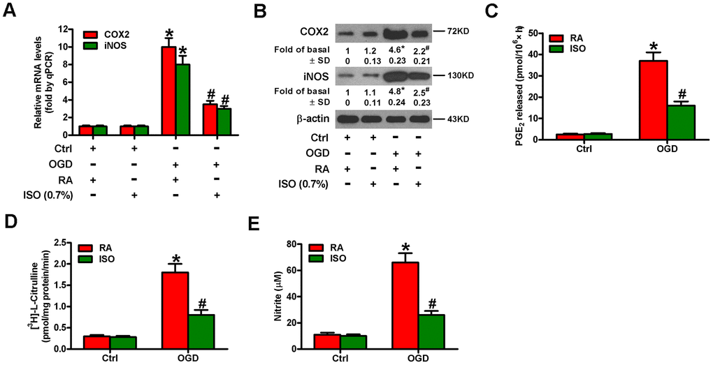 Sub-anesthetic ISO post-conditioning represses OGD-induced COX2/PGE2 and iNOS/NO generation and inflammatory responses in rat microglial cells