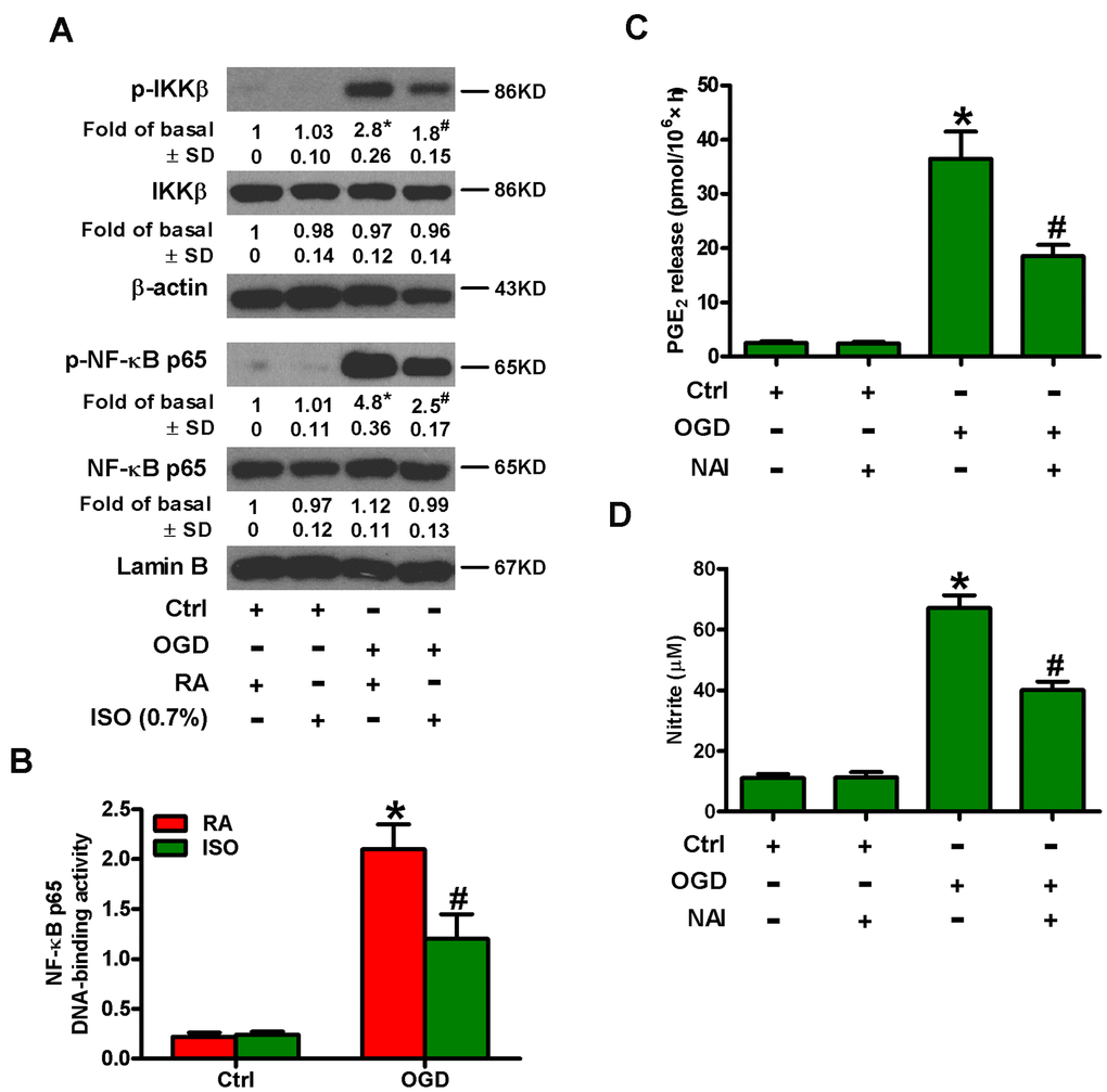 NF-κB is an important transcription activator that regulates the expression of various inflammatory mediators, such as COX2 and iNOS [15, 16]. Therefore, we analyzed whether 0.7% ISO affected OGD-induced NF-κB activation. Western blot analysis revealed that 0.7% ISO reduced OGD-induced phosphorylation of IκB kinase β (IKKβ) and NF-κB p65 in microglial cells (Figure 5A). We further demonstrated that 0.7% ISO abated OGD-induced NF-κB DNA-binding activity in rat microglial cells by TransAM NF-κB DNA-binding ELISA assay (Figure 5B). We confirmed the central role of NF-κB by showing that pre-treating OGD-insulted microglial cells with NF-κB activation inhibitor (NAI) decreased PGE2 release (Figure 5C) and NO production (Figure 5D). These results illuminate that 0.7% ISO attenuates OGD-induced NF-κB activation in rat microglial cells.