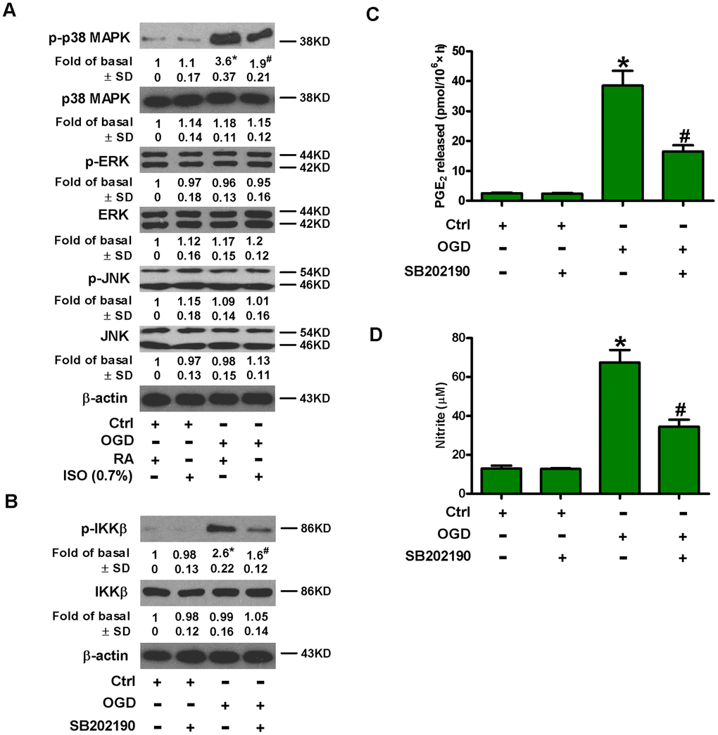 MAPK signaling activates NF-κB, which is essential for the induction of multiply inflammatory mediators [24]. We probed the effect of 0.7% ISO on phosphorylation of MAPKs in OGD-exposed microglial cells. OGD upregulated phospho-p38 MAPK, whereas, phosphorylated and non-phosphorylated ERK1/2 and JNK1/2 as well as p38 MAPK remained unchanged (Figure 6A). Moreover, 0.7% ISO reduced OGD-increased phospho-p38 MAPK in rat microglia (Figure 6A). Pretreatment with SB202190, a p38 MAPK inhibitor, hampered the OGD-induced phosphorylation of IKKβ (Figure 6B), release of PGE2 (Figure 6C) and production of NO (Figure 6D). These data demonstrate that 0.7% ISO hinders OGD-induced NF-κB activation in rat microglial cells by inhibiting p38 MAPK phosphorylation.