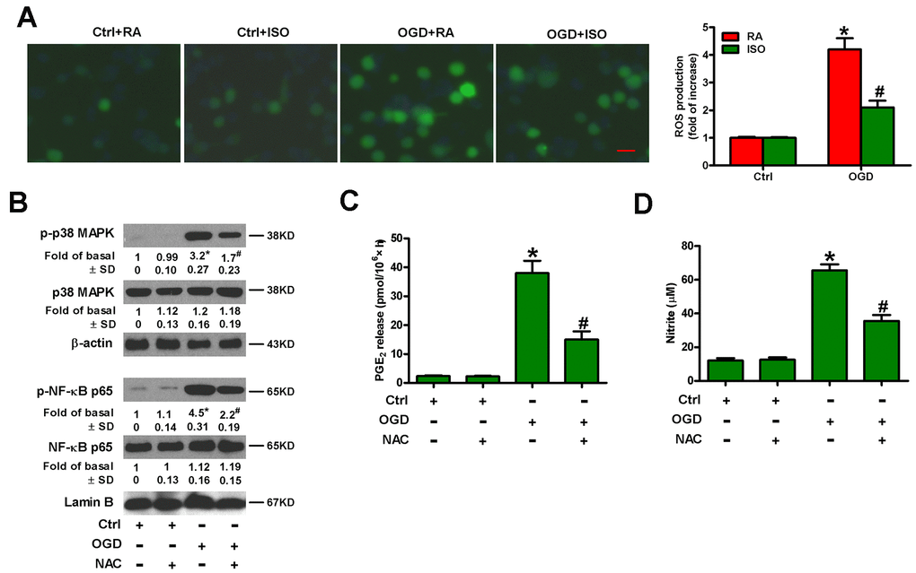 OGD leads to oxidative stress in microglia [25]. ISO reduces ROS production in zymosan-insulted murine Kupffer cells [17]. Thus, we addressed whether 0.7% ISO repressed OGD-induced ROS signaling in microglial cells. As shown in Figure 7A, 0.7% ISO reduced OGD-enhanced ROS generation in microglial cells. ROS is essential for inflammatory promotion because it increases the activation of p38 MAPK and downstream NF-κB in Kupffer cells [17]. Pretreatment of rat microglial cells with N-acetyl-L-cysteine (NAC) reduced OGD-induced phosphorylation of p38 MAPK and NF-κB p65 (Figure 7B), PGE2 release (Figure 7C) and NO production (Figure 7D). These results suggest that 0.7% ISO suppresses ROS-mediated p38 MAPK/NF-κB signaling in OGD-challenged rat microglial cells.