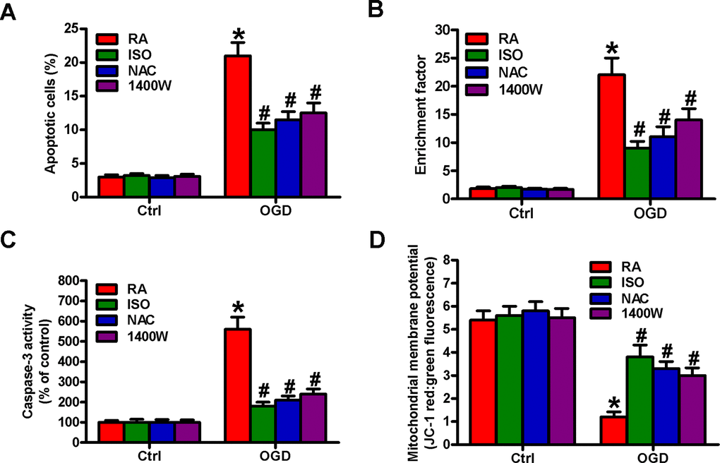 OGD results in BV-2 cell apoptosis [19]. We observed the effects of 0.7% ISO on the apoptosis of OGD-treated microglial cells. Flow cytometry analysis showed that 0.7% ISO decreased OGD-induced microglial cell apoptosis (Figure 8A). Moreover, 0.7% ISO reduced OGD-enhanced nucleosomal fragmentation (Figure 8B) and caspase-3 activity (Figure 8C) in microglia. The low mitochondrial membrane potential was recovered by 0.7% ISO in OGD-challenged microglial cells (Figure 8D). ROS and NO are highly involved in microglial cell apoptosis [7, 8]. Pretreatment with NAC or 1400W significantly reduced OGD-elevated apoptotic microglial cells (Figure 8A–8D), in parallel with 0.7% ISO. These data imply that 0.7% ISO suppresses OGD-induced microglial cell apoptosis by inhibiting ROS and NO production.