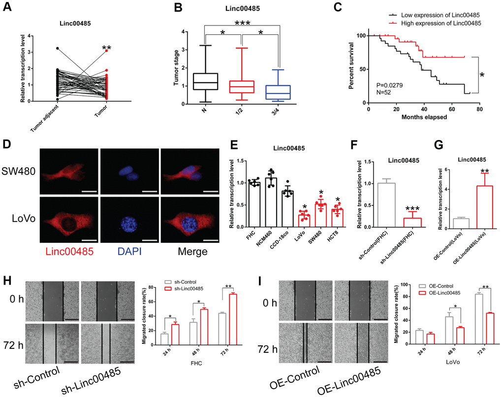 To understand the role of LINC00485 in CRC, we collected normal paracancerous tissue and tumor tissues from 52 patients with CRC. We found that the expression of LINC00485 in CRC tissues was significantly lower than that in adjacent normal tissues (Figure 1A). There was no significant correlation between LINC00485 expression and clinical parameters such as patient’s age and sex (data not shown), but LINC00485 expression was strikingly reduced with tumor stage (Figure 1B). Next, lower and higher LINC00485 expression groups were defined according to median LINC00485 expression values. The data indicated that CRC patients with higher expression of LINC00485 survived longer than patients with lower expression of LINC00485 (Figure 1C). To determine the subcellular localization of LINC00485 in CRC cells, cells were examined by FISH assay using fluorescent probes. We found that LINC00485 was mainly expressed in the cytoplasm of CRC cells (SW480, LoVo) (Figure 1D) and human normal colorectal epithelial cells (FHC) (Supplementary Figure 1). Moreover, LINC00485 levels in CRC cells (LoVo, SW460, HCT8 cell lines) were markedly lower than in human normal colorectal epithelial cell lines (FHC, NCM460, CCD-18co cells) (Figure 1E). We further demonstrated that shRNA-mediated knockdown of LINC00485 could enhance the migratory ability of FHC cells, while overexpression of LINC00485 significantly attenuated the migration of LoVo cells (Figure 1F–1I). These findings suggested that LINC00485 was implicated in CRC progression.
