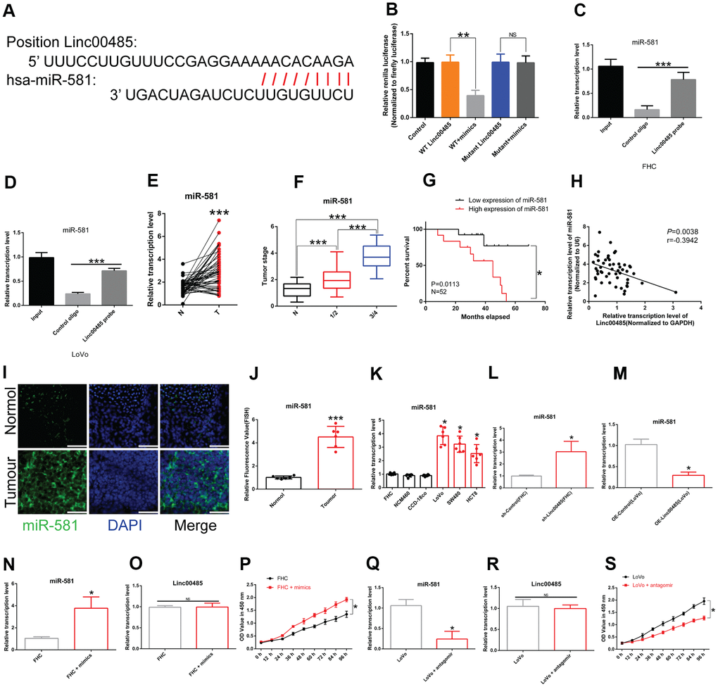 To determine the mechanism underlying the involvement of LINC00485 in CRC progression, the biological prediction website DIANA-LncBase v2 [16] was used to predict targets of LINC00485. The results showed that miR-581 shared complementary binding sites with LINC00485 (Figure 2A). Dual-luciferase reporter assays and RNA immunoprecipitation (RIP) analysis confirmed the interaction between LINC00485 and miR-581 (Figure 2B–2D). MiR-581 was highly expressed in CRC tissues compared with normal tissues (Figure 2E) and was significantly associated with tumor stage (Figure 2F). CRC patients with miR-581 levels above median values have significantly worse prognosis (Figure 2G). We observed a negative correlation between LINC00485 and miR-581 in CRC (Figure 2H). Further, our data showed that miR-581 levels were significantly higher in CRC cell lines and specimens than in human normal colorectal epithelial cell lines and normal samples (Figure 2I–2K). In addition, LINC00485 knockdown significantly increased the expression of miR-581 in FHC cells, and the overexpression of LINC00485 decreased miR-581 levels in LoVo cells (Figure 2L, 2M). Treatment with miR-581 mimics or antagomir strongly reduced or elevated miR-581 levels, neither of which had any effect on LINC00485 expression; however, miR-581 knockdown significantly enhanced the cell viability of FHC cells, whereas the overexpression of miR-581 caused decreased proliferative activity of LoVo cells compared to the matched control cells (Figure 2N–2S).
