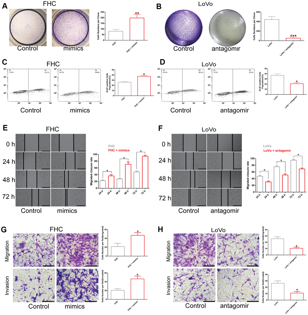 For cell migration and invasion (the upper chamber was coated with Matrigel) assays, a 24-well Transwell plate system (Cell BioLabs, Inc., San Diego, CA, USA) was used to measure the migration and invasive capabilities of both CRC and FHC cells. Matrigel was obtained from Gibco. The experimental protocol has been described previously in detail [27]. After seeding, waited 12 hours before subsequent fixation, staining, and photographing.