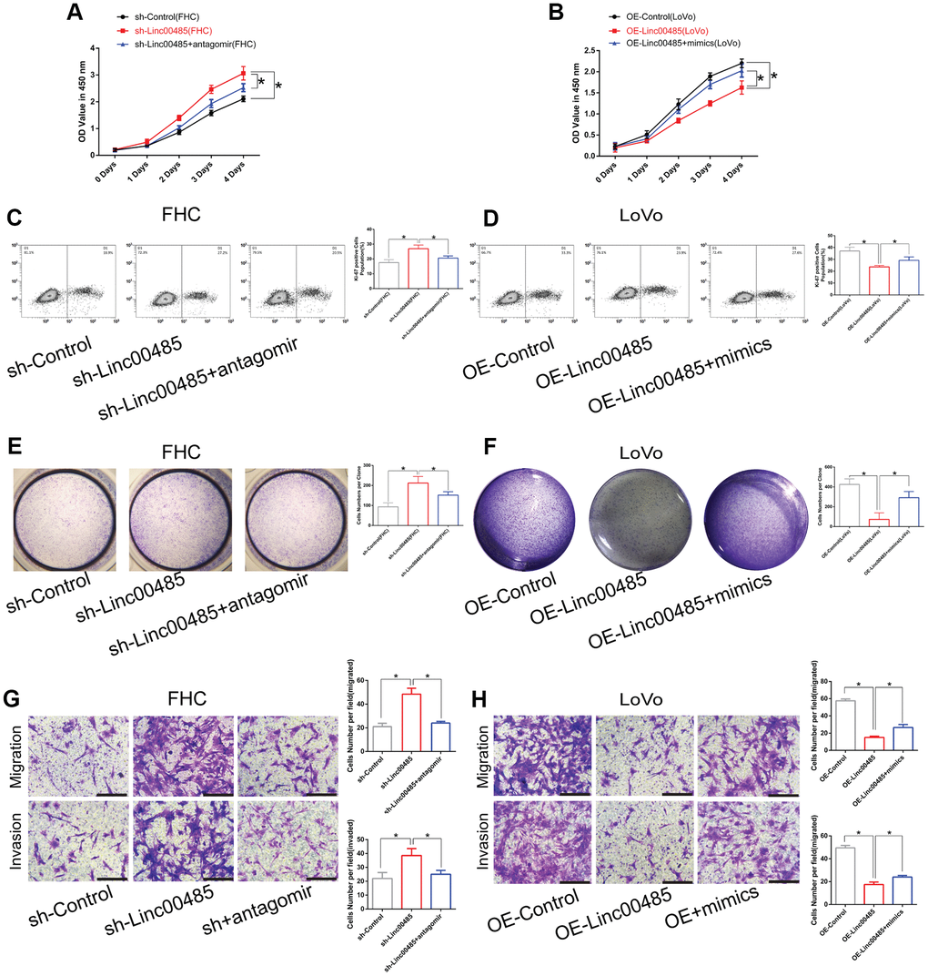To determine how LINC00485 exerts its functions by regulating miR-581, we performed a series of functional experiments in vitro. Our findings demonstrated that overexpression of miR-581 promoted proliferation, migration, and invasion of human normal colorectal epithelial cells (FHC), whereas miR-581 down-regulation suppressed the proliferative, invasive, and migratory abilities of CRC cells (LoVo) when compared with the matched control group (Figure 3A–3H; Supplementary Figure 2). Furthermore, LINC00485 silencing significantly elevated the proportion of Ki-67-positive cells, up-regulated the protein expression level of proliferative markers PNCA and Ki-67, arrested cell cycle in Go/G1 phase (Supplementary Figure 3), enhanced colony formation, cell migration, and invasion capabilities of FHC cells in comparison to control cells, which could be partially reversed by miR-581 silencing (Figure 4A, 4C, 4E, 4G). Additionally, LINC00485-overexpressed LoVo cells demonstrated a significant reduction in the percentage of Ki-67-positive cells, the expression levels of PNCA and Ki-67, and in colony formation, proliferative, migratory, and invasive capacities compared with the control groups; however, overexpression of miR-581 partially abolished LINC00485 overexpression-induced inhibition of cell proliferation, migration, and invasion in LoVo cells (Figure 4B, 4D, 4F, 4H; Supplementary Figure 3). These findings suggested that LINC00485 regulated CRC progression by acting via miR-581.