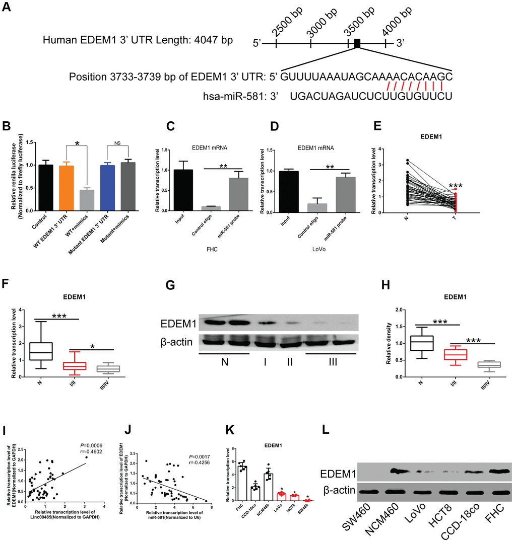 To explore downstream targets of miR-581, we performed bioinformatics analysis using TargetScan (http://www.targetscan.org/) to predict messenger RNA (mRNA) targets. We identified the complementary sites between miR-581 and EDEM1 (Figure 5A). Dual-luciferase reporter assays revealed that wild-type (WT) LINC00485, but not the mutant LINC00485, could directly bind to miR-581. When miR-581 was co-transfected with the WT 3'- untranslated region (3'UTR) of EDEM1 into 293T cells, the luminescence activity was significantly reduced, while when miR-581 was co-transfected with mutant 3'UTR of EDEM1 into 293T cells, no differences were observed, indicating that miR-581 targeted the WT 3'UTR of EDEM1, but not the mutant 3'UTR of EDEM1 (Figure 5B). RIP and real time quantitative polymerase chain reaction (RT-qPCR) experiments further confirmed the binding relationship between miR-581 and 3'UTR of EDEM1 mRNA (Figure 5C, 5D). Moreover, by searching The Cancer Genome Atlas (TCGA) dataset, we found that expression of EDEM1 was significantly down-regulated in CRC tissues compared to adjacent normal tissues (Supplementary Figure 4A). EDEM1 expression also showed significant differences in correlation with the patient's sex, tumor type, and stage (Supplementary Figure 4B–4D). A further search of the Human Protein Atlas (HPA) database revealed that the overall survival of CRC patients with low EDEM1 expression was significantly lower than those with high EDEM1 expression (Supplementary Figure 4E). In our study, levels of EDEM1 were markedly decreased in CRC tissues compared with normal tissues (Figure 5E), an association that correlated with tumor stage (Figure 5E–5H). EDEM1 expression was positively correlated with LINC00485 levels (Figure 5I), while it inversely correlated with miR-581 expression (Figure 5J). EDEM1 expression in vitro was significantly reduced in CRC cell lines compared to human normal colorectal epithelial cells at both the transcriptional and translational levels (Figure 5K, 5L).