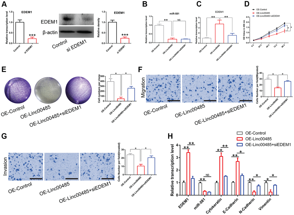 To unravel whether the LINC00485/miR-581 axis exerts its biological function by modulating EDEM1 expression, small interfering RNA (siRNA) targeting EDEM1 were used to inhibit EDEM1 expression in LoVo cells, which resulted in a significant reduction of EDEM1 expression compared to the untransfected cells (Figure 6A). In LINC00485-overexpressing LoVo cells, miR-581 levels were significantly down-regulated; however, further treatment with siEDEM1 had no effect on miR-581 expression (Figure 6B), but markedly reduced EDEM1 expression as expected (Figure 6C). Consistent with previous results, LINC00485 knockdown exhibited significant suppressive activity in LoVo cells. Transfection siEDEM1 partially counteracted LINC00485 knockdown-induced reduction of cell proliferation (Figure 6D), colony formation (Figure 6E), migration (Figure 6F), and invasion (Figure 6G) abilities of LoVo cells compared with the untransfected LINC0048-knockdown cells. These results confirmed that LINC00485 exerted its effects by regulating the EDEM1/miR-581 axis. EMT contributes to the pathogenesis of cancer metastasis [17]. In this cellular context, the expression of epithelium-related genes (cytokeratin, E-cadherin) was significantly upregulated, while that of mesenchymal-associated genes (N-cadherin, vimentin) was downregulated in LINC00485-overexpressed LoVo cells compared to control cells. Further knockdown of EDEM1 using siRNA, could partially reverse the changes caused by LINC00485 overexpression (Figure 6H).
