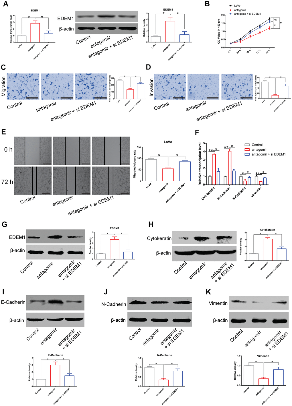 Meanwhile, miR-581 antagomir treatment enhanced the expression of epithelial markers E-cadherin and cytokeratin, but down-regulated the expression of mesenchymal markers N-cadherin and vimentin in LoVo cells at both the transcriptional and translational levels (Figure 7F–7K). Of note, our rescue experiments showed that siEDEM1 treatment could partially reverse the above-mentioned changes in gene expression induced by the knockdown of miR-581 (Figure 7F–7K). Cumulatively, these data further supported our findings that the LINC00485/miR-581/EDEM1 axis regulated CRC progression.
