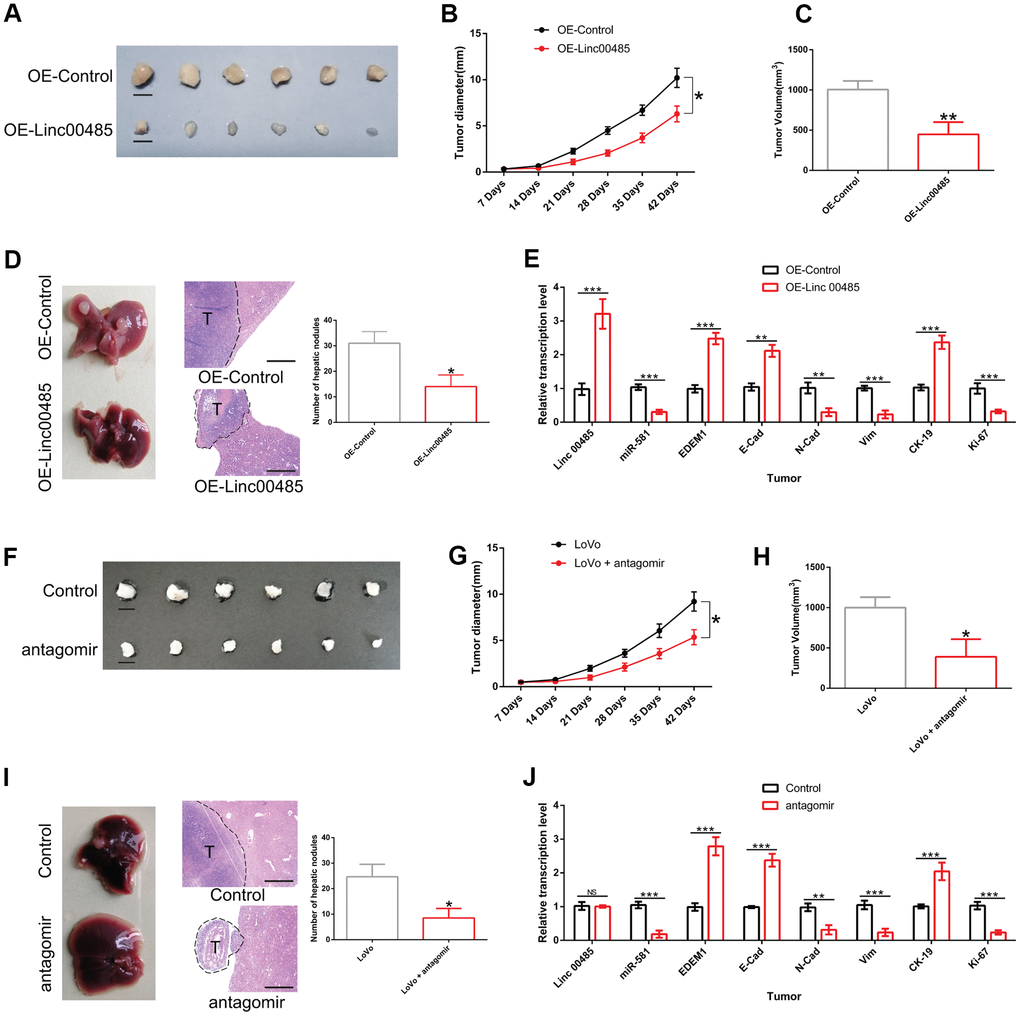 We established a xenograft nude mouse model and liver metastasis model to investigate the effects of LINC00485 and miR-581 on CRC cell growth and metastasis in vivo. As described in the Methods section, tumor growth was monitored weekly. When the diameter of the largest tumor reached 1 cm, the nude mice met the humane endpoints of the study. All animals were sacrificed under anesthesia. Tumors were excised and the volumes were measured. We found that overexpression of LINC00485 significantly decreased tumor diameter, tumor volume at day 42, and the number of hepatic nodules in comparison to the control group, suggesting that the up-regulation of LINC00485 suppressed tumor growth and liver metastasis of CRC cells (Figure 8A–8D). Additionally, miR-581 antagomir injection also contributed to the decrease of tumor diameter, tumor volume at day 42, and the number of metastatic nodules of LoVo cells, indicating that miR-581 knockdown restricted CRC cell growth and liver metastasis in vivo (Figure 8F–8I). Furthermore, the expression levels of epithelium markers (cytokeratin, E-cadherin), mesenchymal markers (N-cadherin, vimentin), and cell proliferation markers (CK-19, Ki-67) were evaluated by RT-qPCR in metastatic nodules of nude mice. We found that the results were consistent with in vitro observations (Figure 8E, 8J). Overall, it can be concluded that the LINC00485/miR-581/EDEM1 axis may represent an important mechanism involved the malignant progression of CRC.