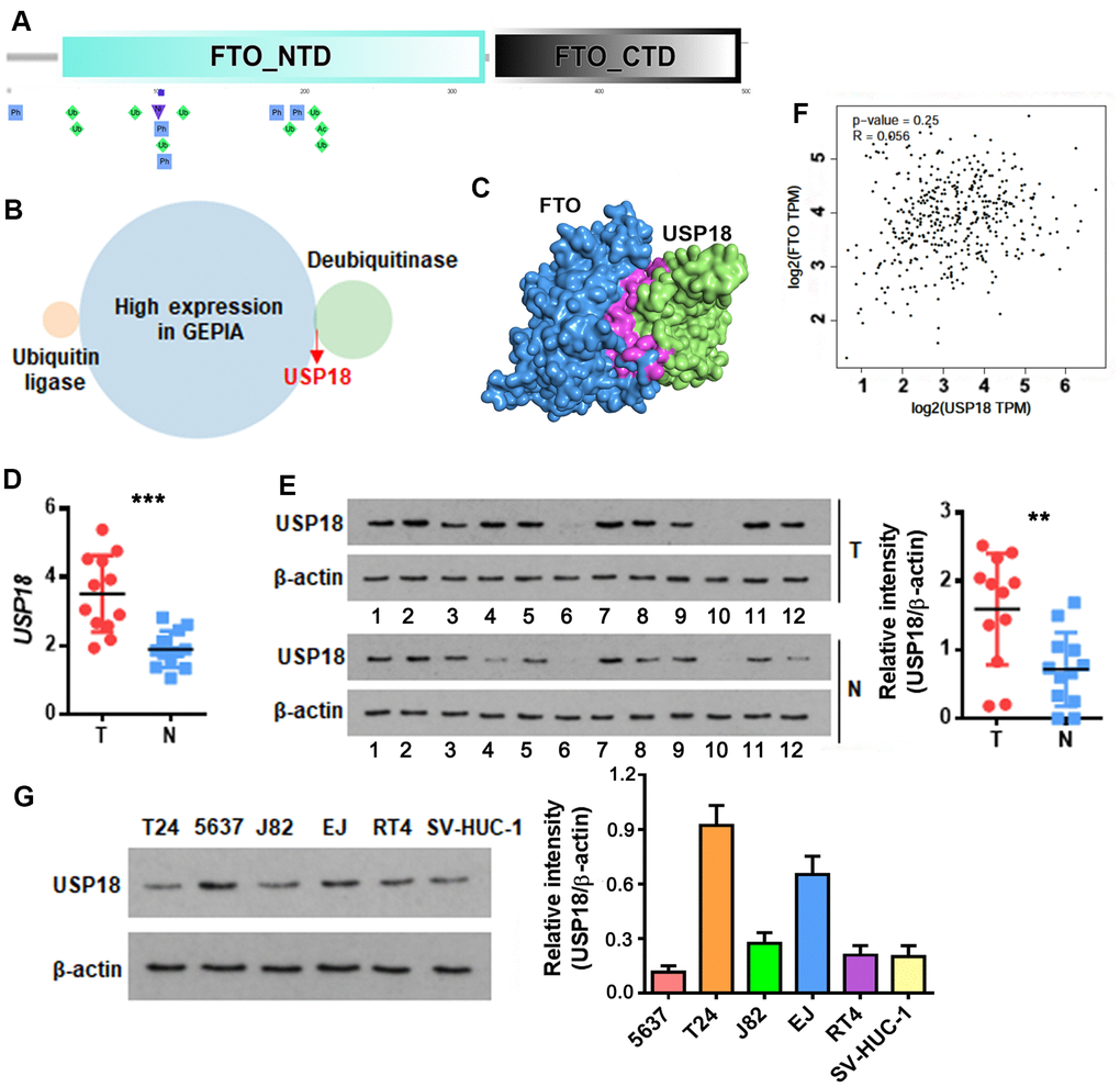 An increase in protein but not mRNA level was reminiscent of post-translational modification of FTO in bladder tumors. Recently, Zhu et al. reported that cellular FTO protein turnover is regulated by post-translational ubiquitination on lysine-216 [22]. Prediction through PTMcode database [23] showed three potential ubiquitination sites including K194, K211 and K216 in the N-terminal domain of FTO (Figure 2A). We further searched in UbiBrowser [24] for FTO-targeting ubiquitin ligase and deubiquitinase genes, and overlapped them separately with the upregulated BLCA signatures in Gene Expression Profiling Interactive Analysis (GEPIA) database [25]. No FTO-targeting ubiquitin ligase was upregulated in BLCA tissues (Figure 2B), while deubiquitinase USP18 was highly induced (Figure 2B). HDOCK server [26]-based protein-protein interaction analysis indicated that USP18 directly binds to FTO protein domain ranging from 190 to 220 amino acid, where the 3 putative ubiquitination sites are located (Figure 2C). Up-regulation of USP18 was further confirmed in patient-derived bladder tumors in this study (Figure 2D, 2E). However, there was no appreciable correlation between the expression of USP18 and FTO at mRNA level (Figure 2F). These data implied an interaction between USP18 and FTO at protein but not mRNA level. Consistent with these patient tumor-derived data, USP18 was also up-regulated in numerous bladder cancer cell lines (Figure 2G).