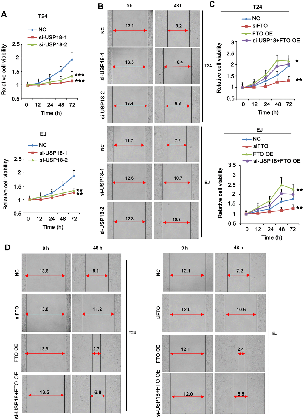 Next, we determined the roles of FTO and USP18 in the tumorigenic propensities of BLCA cells. Both USP18-depleted T24 and EJ cells displayed an apparent growth retardation (Figure 4A) as well as impaired cell migration (Figure 4B) compared to their corresponding parental cells. The phenotypes were photocopied upon silencing FTO (Figure 4C, 4D). Instead, overexpress FTO promoted proliferation (Figure 4C) and migration (Figure 4D) of BLCA cells comparing to the respective control cells. However, USP18 silencing blocked the proliferation and migration induced by FTO. These data indicated that USP18-mediated increase of FTO protein stability exacerbates BLCA progression by enhancing carcinogenic properties of the tumor cells.
