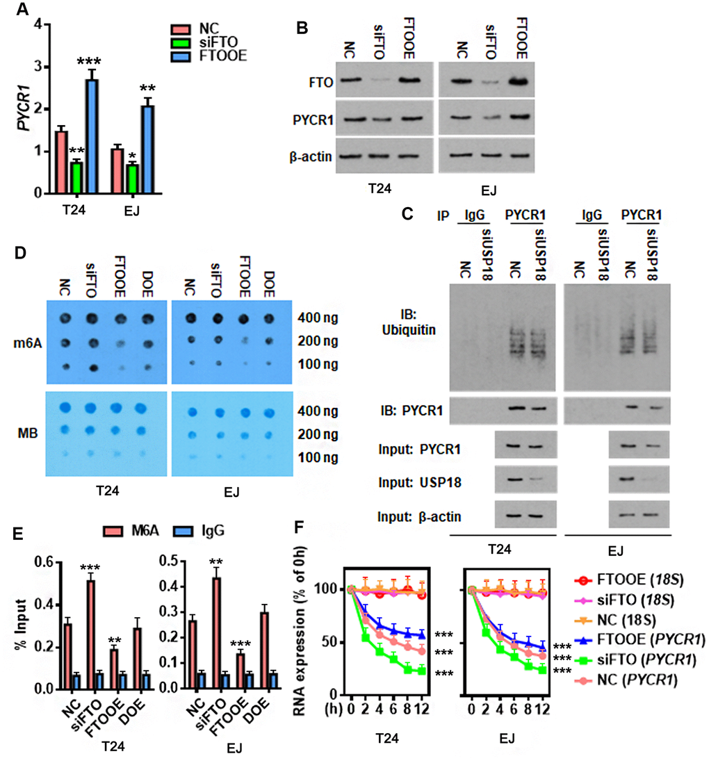 BLCA tissues or cells were lysed using RIPA buffer (1% NP-40, 0.1% SDS, 50 mM DTT) supplemented with protease inhibitor cocktail containing 2 μg/ml Aprotinin, 2 μg/ml Leupeptin and 1 mM PMSF. The lysates were subject to ultrasonication followed with centrifuged for 10 min at 9,000 rpm to collect the supernatants. Equal amount of total proteins from each sample were resolved by 10% SDS-PAGE and electroblotted onto polyvinylidene difluoride membranes. Immunoblotting was performed with anti-FTO (RD, #MAB7208), anti-USP18 (Abcam, #ab168478), anti-PYCR1 (Abcam, #ab226340) and anti-β-actin (Ptgcn, #66009-1-Ig) antibodies.