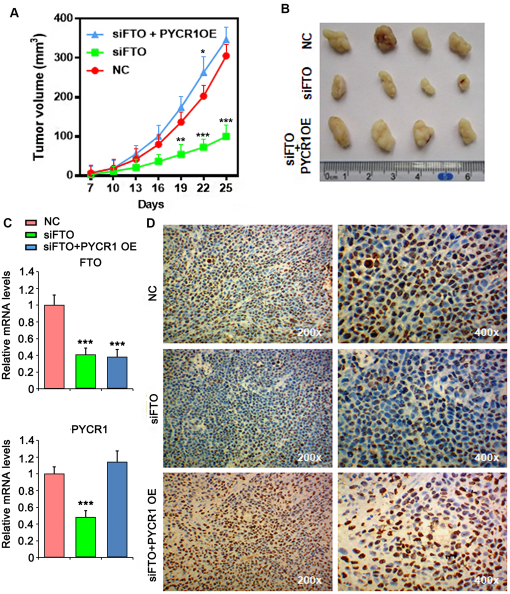 Finally, we assessed the roles of FTO and PYCR1 in xenograft tumor growth in vivo. As expected, loss of FTO significantly compromised xenograft tumor growth in nude mice compared to the control group (Figure 8A, 8B, 8C). However, simultaneously overexpress PYCR1 promoted FTO-depleted tumor growth (Figure 8A, 8B, 8C). Consistently, immunohistochemical staining on these tumors displayed that comparing to the control tumors, cells in FTO-deficient tumors were less proliferative as indicated by the sporadic Ki67-positive staining (Figure 8D). Instead, FTO-depleted but PYCR1-overexpressing tumors were filled with Ki67-positive proliferating cells (Figure 8D). Taken together, these data suggest that FTO/PYCR1 axis promotes bladder tumorigenesis in vivo.