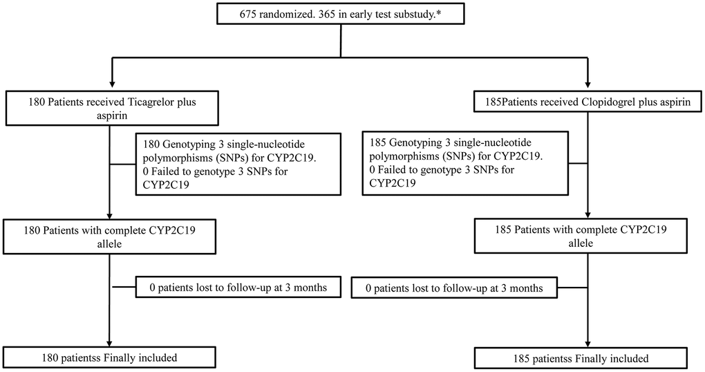 Study flow was shown in Figure 1. We conducted valid measurements in 376 and 373 patients for VerifyNow P2Y12 assay at 2 hours and 24 hours after first dose respectively. A total of 365 out of 675 patients with acute minor stroke and TIA were finally included in our early test sub-study with no patient missed CYP2C19 genotype data or lost to follow up. Patients included tended to be older, have a history of dyslipidemia, use statin and aspirin before randomization (Table 1). Among the 365 included patients, 105 (28.8%) of them were female, the average age was 61.7±8.5 years, 199 (54.5%) of them were classified as carriers of CYP2C19 LOF alleles, 180 (49.3%) of them received ticagrelor/aspirin therapy and 185 (50.7%) of them received clopidogrel/aspirin therapy (Table 2). Baseline characteristics between LOF allele carriers and non-carriers were well balanced.