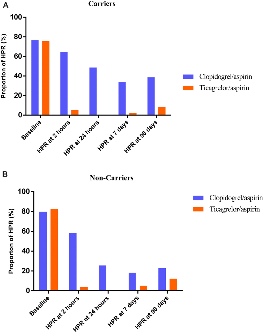 For carriers and non-carriers, proportions of HOPR were significantly lower during ticagrelor/aspirin therapy compared with clopidogrel/aspirin therapy at 2 hours, 24 hours, 7 days, respectively (all p<0.05), which were similar at baseline (Table 3). The proportion of HOPR in the ticagrelor/aspirin group was only significantly lower than that in the clopidogrel/aspirin group in carriers, while no significant difference was found in proportions of HOPR between ticagrelor/aspirin group and clopidogrel/aspirin group in non-carriers at 90 days (HOPR proportion among carriers, 8.0% with ticagrelor/aspirin therapy vs 38.6% with clopidogrel/aspirin therapy; risk ratio (RR), 0.21; 95% confidence intervals (CI), 0.09-0.41; p<0.001; HOPR proportion among non-carriers, 12.3% with ticagrelor/aspirin therapy vs 22.7% with clopidogrel/aspirin therapy; RR, 0.54; 95% CI, 0.25-1.11; p=0.11; p=0.37 for interaction). The Ticagrelor/aspirin therapy was more effective in reducing proportion of HOPR independent of CYP2C19 metabolizer status and seemed to eliminate HOPR at 24 hours in both carriers and non-carriers (Figure 2).