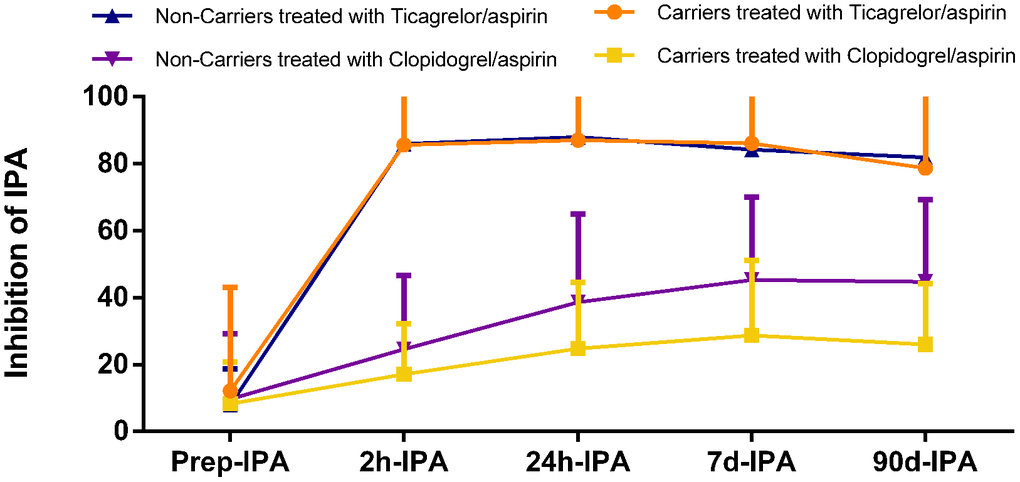 IPA was higher at all time points except at baseline in patients treated with ticagrelor/aspirin therapy compared with those treated with clopidogrel/aspirin therapy in both carriers and non-carriers of CYP2C19 LOF alleles (all p<0.001 for 2h, 24h, 7d and 90d-IPA, respectively; Table 4). IPA was similar in carriers and non-carriers treated with ticagrelor/aspirin therapy, while was different between carriers and non-carriers treated with clopidogrel/aspirin therapy (Figure 3).