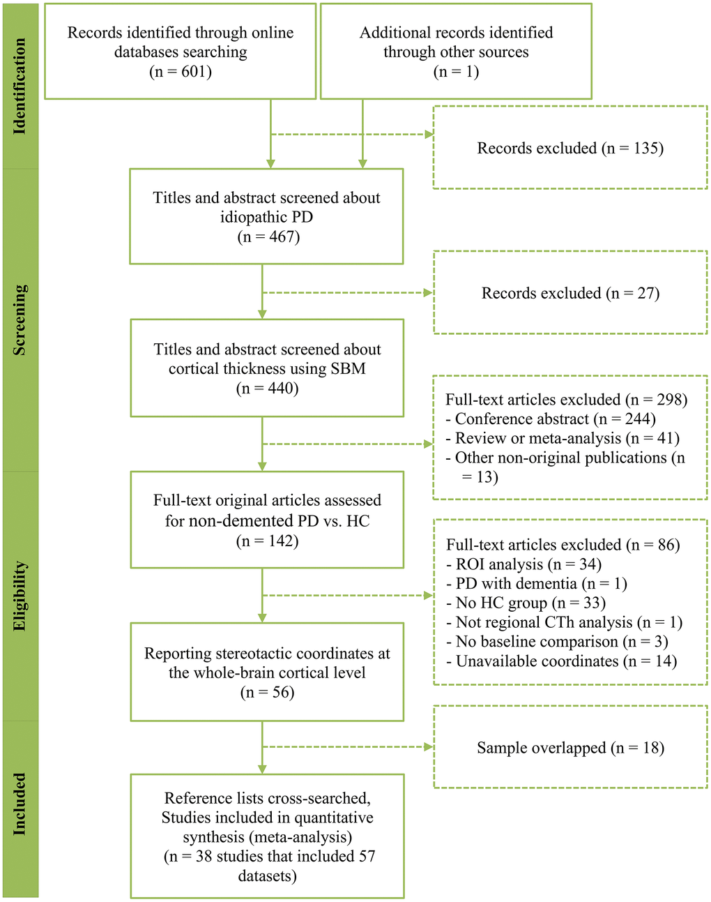Publications were excluded if: (i) the sample size was less than seven either in the PD group or the HC group [51]; (ii) studies included PD patients with dementia; (iii) studies reported significant results without listing the three-dimensional coordinates; (iv) studies only employed regions of interest analysis, small volume corrections, or other statistical thresholds that varied depending on the brain regions; (v) studies only conducted global CTh analysis; (vi) studies lacked an HC group; (vii) studies included patient samples overlapping with that with the largest sample size; (viii) studies were longitudinal without baseline comparisons; (ix) publications were not original articles, such as conference abstracts, research protocols, letters, reviews, and editorials.