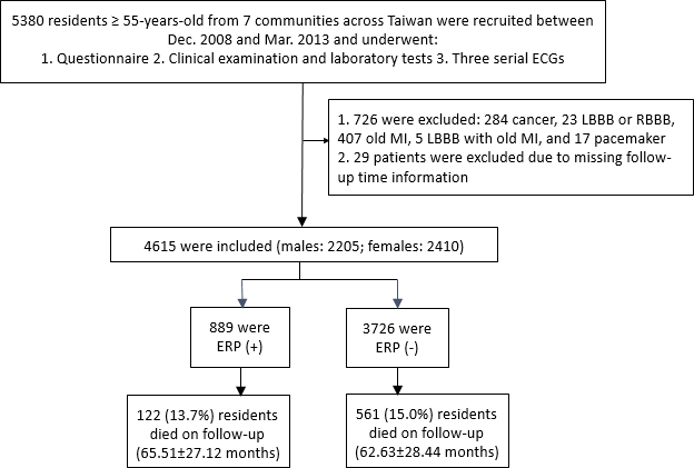 The flowchart of enrollment and inclusion criteria of the study subjects is shown in Figure 1. We initially recruited 5,380 relatively healthy and ambulatory individuals from 7 communities across Taiwan. We then excluded 755 individuals with cancer and underlying severe cardiovascular diseases (e.g., myocardial infarction or pacemaker implantation), as well as those with missing follow-up information. Finally, we included 4,615 healthy individuals in this study. The prevalence of ERP in the study cohort was 19.3% (n=889/4,615). In the ERP (+) group, 122 out of 889 individuals died during follow-up (65.51±27.12 months). In the ERP (-) group, 561 out of 3726 individuals died during follow-up (62.63±28.44 months).