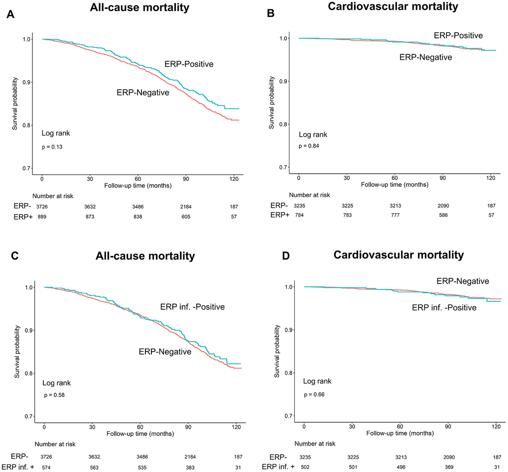 We observed that all-cause and cardiovascular mortality rates were similar in ERP (+) and ERP (-) groups during a mean follow-up time of 95.1±21.9 months (log-rank test, P=0.13 and P=0.84, respectively; Figure 3A, 3B). Since previous studies showed that ERP in the inferior leads was a risk factor for all-cause and cardiovascular mortality [17], we performed Kaplan-Meier survival curve analysis to investigate the association between the two types of mortality and positive ERP in the inferior leads (ERP-inf+). The results showed that all-cause and cardiovascular mortality rates were similar for individuals with and without ERP in the inferior leads (log-rank test, P=0.58, 0.66, Figure 3C, 3D).