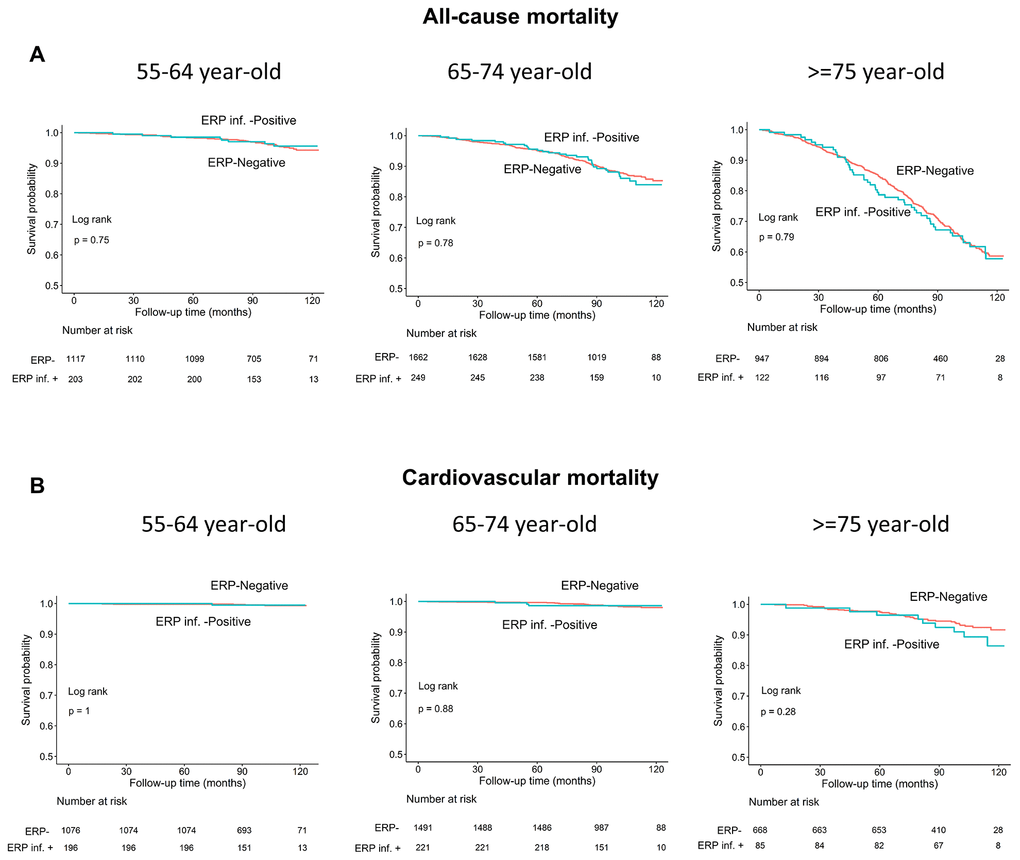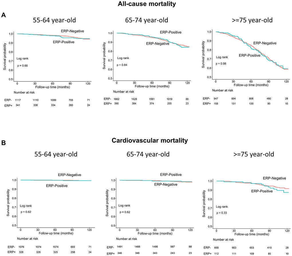 Long-term outcomes of all-cause mortality and cardiovascular mortality and ERP stratified by age