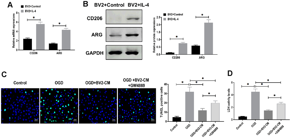 Microglia in M2 phenotype play a crucial neuroprotective role in several brain diseases, such as cerebral ischemia [24] and Parkinson's disease [25]. To detmine the mechanism underlying the neuroprotective effect of microglia, BV2 cells were treated with IL-4 (20 ng/mL) to polarized to M2 phenotype [7, 26]. The results showed that both mRNA and protein expressions of CD206 and ARG, M2 microglia markers [27], were upregulated, compared with control BV2 cells (Figure 1A, 1B). In addition, we found that M2 BV2 cells-conditioned medium (BV2-CM) decreased apoptosis in neurons in the presence of OGD treatment (Figure 1C). In LDH assay, BV2-CM decreased LDH activity, indicating less cellular injury was detected in neurons after OGD treatment (Figure 1D). Intriguingly, we also observed that the addition of GW4869, an inhibitor of exosome secretion [28], partially reversed the effect of BV2-CM on OGD-treated neurons (Figure 1C, 1D). These results together suggested that BV2-derived exosomes may participate in a neuroprotective mechanism in response to OGD.