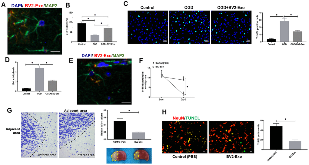 Then, we aimed to determine whether BV2-Exo could be internalized by neurons. BV2-Exo was cocultured with neurons, and the confocal images revealed that PKH26-labeled red BV2-Exo were found in the cytoplasm of MAP2-positive neurons labeled with green fluorescence (Figure 3A). CCK-8 and LDH assays suggested that BV2-Exo significantly increased cell viability of neurons cocultured with BV2-Exo for 24 hours, followed by OGD (Figure 3B, 3D). Apoptosis of neurons induced by OGD was also attenuated by BV2-Exo, as detected by TUNEL staining (Figure 3C). Furthermore, in vivo study, we found that BV2-Exo could also be taken up by neurons of the ischemic mouse brain (Figure 3E). Applying neurobehavioral testing to evaluate neurobehavioral performance in mice treated BV2-Exo, the results showed that BV2-Exo treatment attenuated behavioral deficits induced by tMCAO, compared with those treated with PBS control treatment (Figure 3F). We also observed that the mice treated with BV2-Exo after tMCAO had less infarct area and apoptosis than those in the control group (Figure 3G, 3H). Together, our observations demonstrated that BV2-Exo plays a neuroprotective role in neuronal injury induced by ischemic injury in both in vitro and in vivo.
