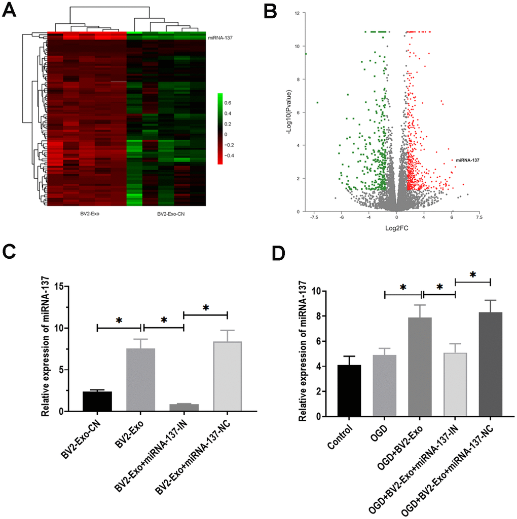 Exosomal miRNAs have been demonstrated as critical functional factors in exosome-mediated intercellular communication [29]. Thus, we speculated that miRNAs might play an essential role in the neuroprotective effect of BV2-Exo. By performing RNA-seq, we identified a group of differentially expressed miRNAs between BV2-Exo and BV2 Exo-CN, as shown in heatmap and volcano plot (Figure 4A, 4B). The results revealed that miRNA-137 was one of the upregulated miRNAs. Given the essential role of miRNA-137 in IRI reported by multiple previous studies [30–32], we hypothesized that miRNA-137 might be an essential mediator for the function of BV2-Exo. Then, we applied RT-PCR assay to verify the results obtained from RNA-seq analysis, and we found that miRNA-137 was also increased in BV2-Exo, relative to BV2 Exo-CN (Figure 4C). Meanwhile, the expression of miRNA-137 was decreased in BV2-Exo derived from BV2 cells treated with miRNA-137-IN (Figure 4C). After OGD treatment, the level of miRNA-137 was increased in neurons treated with BV2-Exo, whereas decreased in those treated with BV2-Exo derived from BV2 cells treated with miRNA-137-IN (Figure 4D). Thus, these results suggested the involvement of miRNA-137 in BV2-Exo-related neuroprotection.