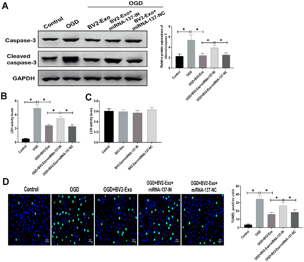 To further determine the function of miRNA-137, we found that the expression of cleaved caspase-3 was significantly decreased in BV2-Exo-treated neurons after OGD, while partially rescued by treatment of BV2-Exo derived from BV2 cells treated with miRNA-137-IN (Figure 5A). For LDH assay, LDH activity was increased by OGD treatment, which was reversed by BV2-Exo and BV2-Exo derived from BV2 cells treated with miRNA-137-IN with different degrees (Figure 5B). Notably, we did not observe the different effects of these treatments on LDH activity in neurons under normal conditions (Figure 5C). Furthermore, TUNEL assay revealed that BV2-Exo with reduced expression of miRNA-137 could also partially reverse the effect of BV2-Exo on apoptosis after OGD (Figure 5D). Together, these results suggested that miRNA-137 participates in, at least in part, the neuroprotective effect of BV2-Exo.