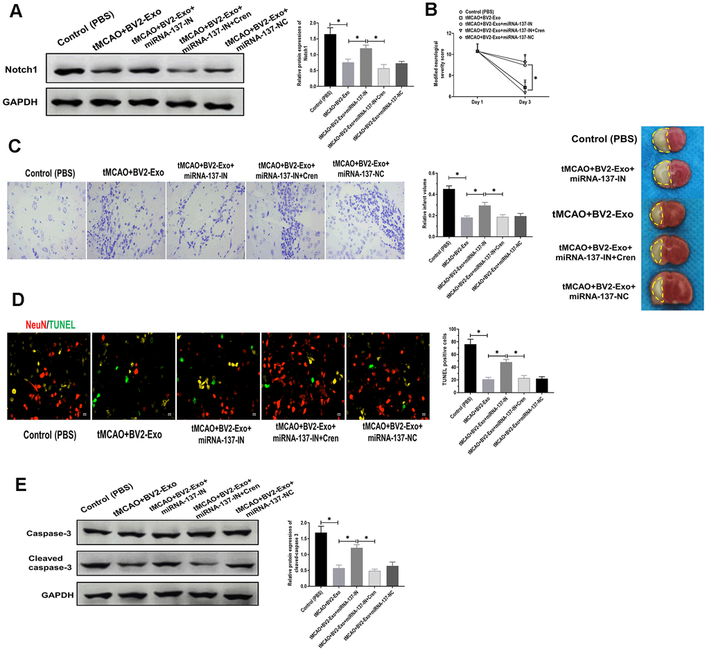 To determine the downstream targeting gene of miRNA-137, we performed bioinformatics analysis in several databases, including MiRanda (MicroRNA.org)) and TargetScan (http://www.targetscan.org). The results showed that there was a potential binding site of miRNA-137 in 3’UTR of Notch1 (Figure 6A). Through performing luciferase reporter assay, the results showed that the luciferase activity was decreased in 293T cells co-transfected with miRNA-137 mimics and luciferase reporter plasmids containing wild-type miRNA-137 binding site, compared with those treated with plasmids containing mutant miRNA-137 binding site (Figure 6B). Also, we found that BV2-Exo significantly decreased mRNA expression of Notch1, which was partially reversed by inhibition of miRNA-137 expression in BV2-Exo (Figure 6C). To further investigate the function of Notch1 in the ischemic mouse model, BV2-Exo, BV2-Exo with reduced expression of miRNA-137, and BV2-Exo with reduced expression of miRNA-137 plus Cren (a selective inhibitor of Notch1) were administrated to ischemic mice, respectively. The results demonstrated that protein expression of Notch1 was decreased in the brains of mice treated with BV2-Exo and BV2-Exo with reduced expression of miRNA-137 plus Cren, while increased in mice treated with BV2-Exo with reduced expression of miRNA-137 (Figure 7A). Functionally, decreased expression of Notch1 induced by BV2-Exo was associated with decreased neurobehavioral deficits, fewer infarct areas in the brain, and less apoptosis (Figure 7B–7D). In contrast, the elevation of Notch1 induced by the downregulation of miRNA-137 led to more severe behavioral deficits, more infarct areas, and more apoptosis (Figure 7B–7D). We also noticed that the effect of increased Notch1 was reversed by Notch1 inhibitor Cren. Furthermore, the expression of cleaved caspase-3 was decreased in mice treated with BV2-Exo and BV2-Exo with reduced expression of miRNA-137 plus Cren while increased in mice treated with BV2-Exo with reduced expression of miRNA-137, compared with those in the control group (Figure 7E). Collectively, these findings suggested that neuroprotective role of BV2-Exo was mediated through miRNA-137/Notch1 pathway.