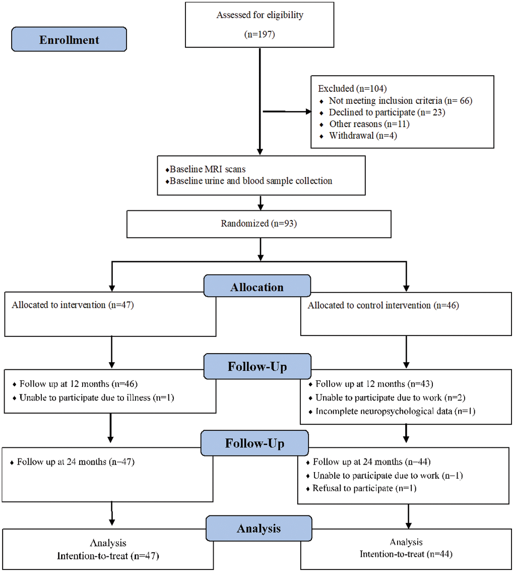 This was a single site, parallel-group, randomized active-controlled trial to assess the efficacy and mechanisms in delaying cognitive decline of CSI versus HEP for two years. The study was approved by the National University of Singapore Institutional Review Board (NUS 2508). All participants gave written informed consent. Four cycles of the interventions are planned, however, only available data from the first cycle are reported as a planned interim analysis. Details of the study protocol have been described previously [15].