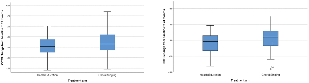 The strengths of our study include low drop-out rate and repeated measurement of cognitive function, brain imaging and markers of biological aging. However, we did not include a non-intervention control group so the true effects of the CSI on various measures in comparison with the natural history of age-related changes are unknown. Also, since CSI was provided as an integrated package, we are not able to tease out relative contributions of the putative cognitive enhancing components such as exposure to music, making music, and interactions in a group setting. Multiple intervention arms (for example: listening to music vs. singing alone vs. choral singing) could be considered in future studies, but such designs increase costs and the complexity of trial logistics. Another obvious limitation is the relatively small sample size, providing only 39% power for the observed difference on absolute changes of CCTS at 24 months, when baseline CCTS was adjusted for.