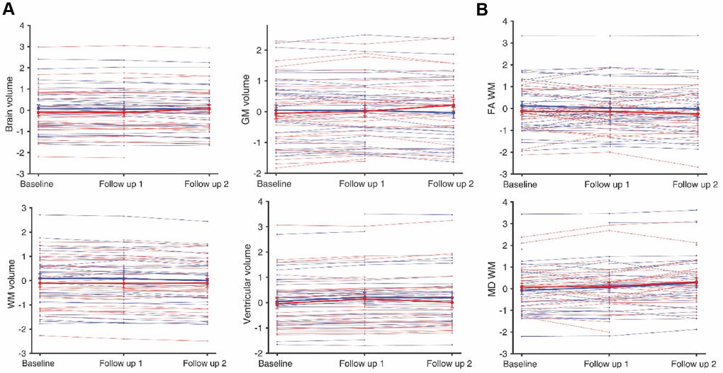 All scans and processed data were quality controlled by an experienced researcher (RRG) to reduce the impact of head motion and other artifacts. Two participants were excluded due to the presence of a brain tumor. Two MPRAGE and three DWI scans were removed due to motion. Six T1-weighted and nine DWI outliers, defined as images with a metric (i.e. volume, FA, and MD) exceeding two standard deviations from the mean, were also excluded from further analyses. Groups remained balanced for age, gender and education after the exclusions.