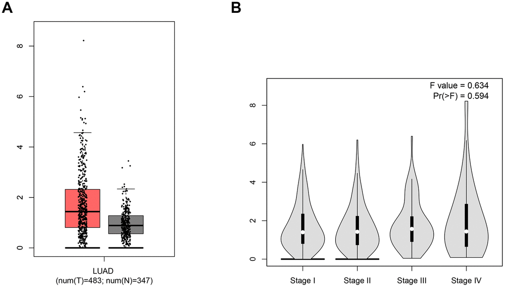 Ang 1-7, the product of ACE2, was confirmed to inhibit the proliferation of human lung cancer cells through interaction with the Mas receptor (MasR) [23]. Ang1-7 not only reduces the size of human lung tumor xenografts in vivo but also markedly decreases their vessel density [24–26]. Thus, the expression level of ACE2 in LUAD would influence the cancer progression. To compare the ACE2 level between LUAD and normal tissues, sequencing data of a total of 830 samples (347 normal tissues and 483 LUAD tissues) were obtained from the TCGA database (Figure 1). In LUAD patients, a higher expression level of ACE2 was detected while there was no significant difference among various stages of LUAD. Due to the function of combining with S glycoprotein, higher ACE2 level might lead to increased risk of SARS-CoV-2 infection.
