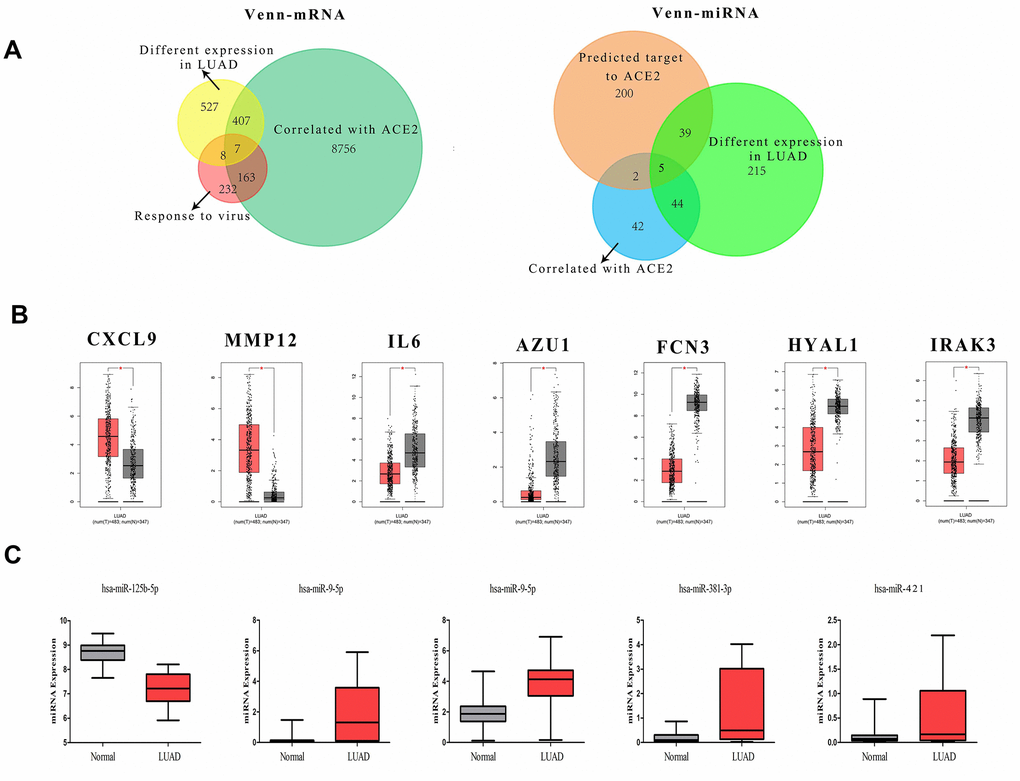 Conventionally, the LUAD patients have lower immunity than healthy persons. The increased ACE2 level in the lung might lead to susceptibility to infection. Nevertheless, the pathology of COVID-19 is complicated, except miRNA introduced in present study, transcription factor, lncRNA and ceRNA may participate in mechanism of COVID. The result of our study may provide a reference for further research.